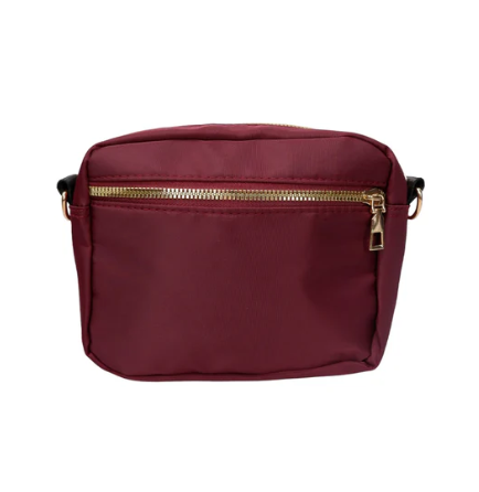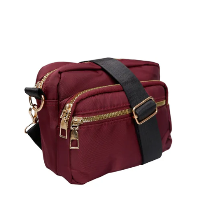 Fin vinrød taske i nylon med rem og guld lynlås. Har mange rum som kan holde alle de nødvendige ting.