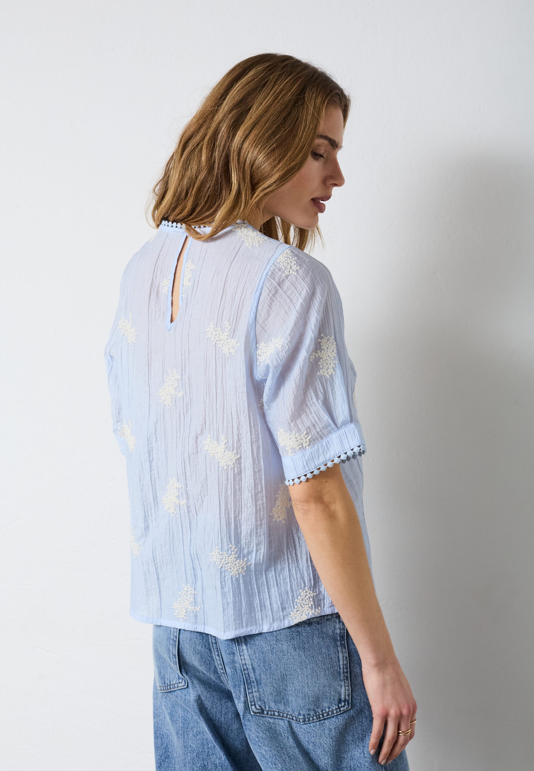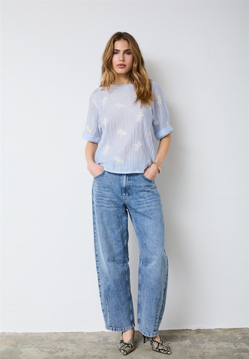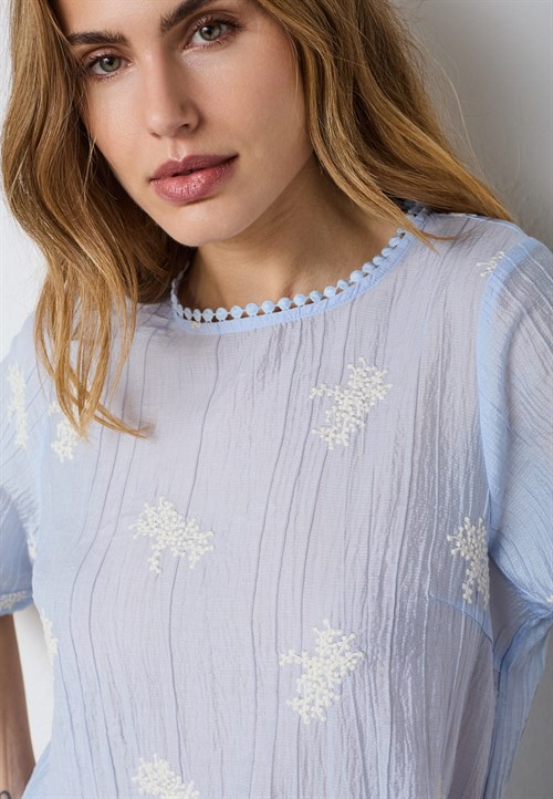 Bluse i lys blå med fine hvide broderi blomster. Blusen har korte ærmer.