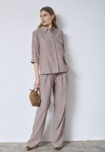 Brune stribet bukser med elastik i taljen, og bindebånd. Bukserne har vidde i benene, og en matchene skjortebluse til.