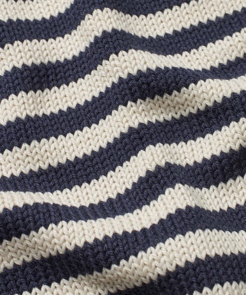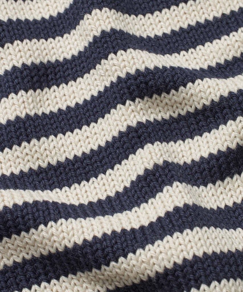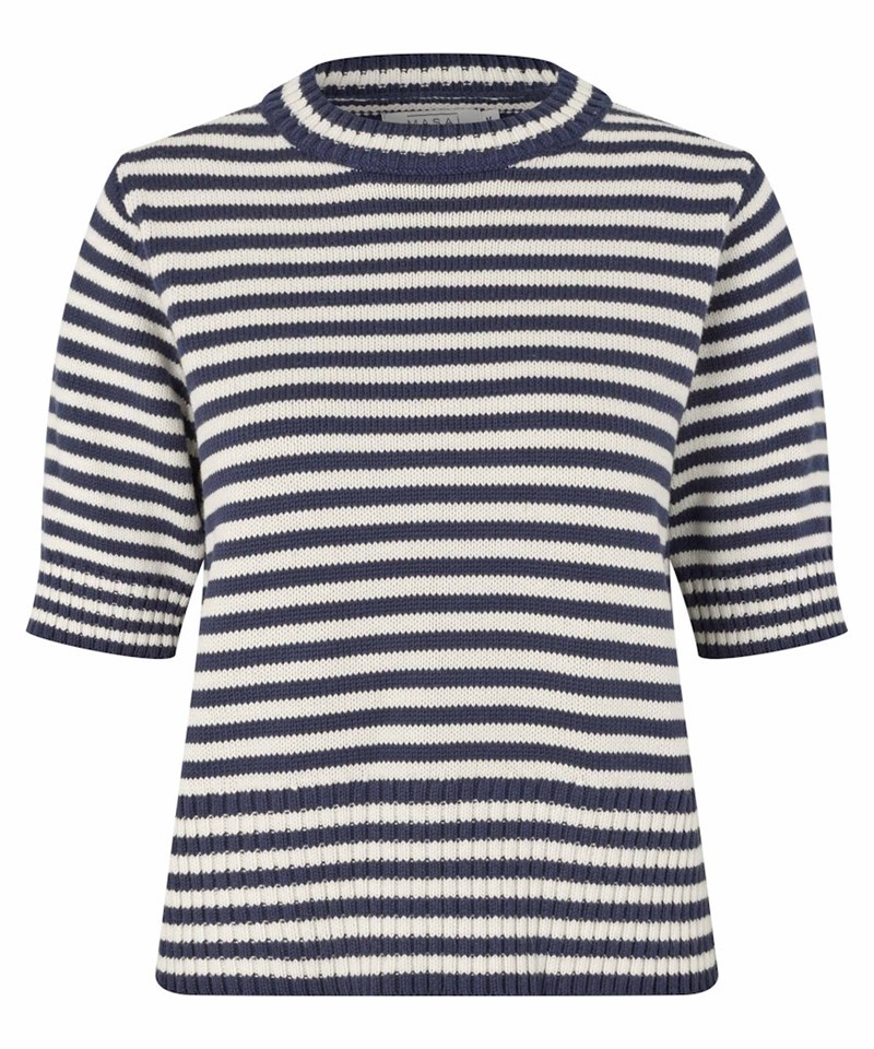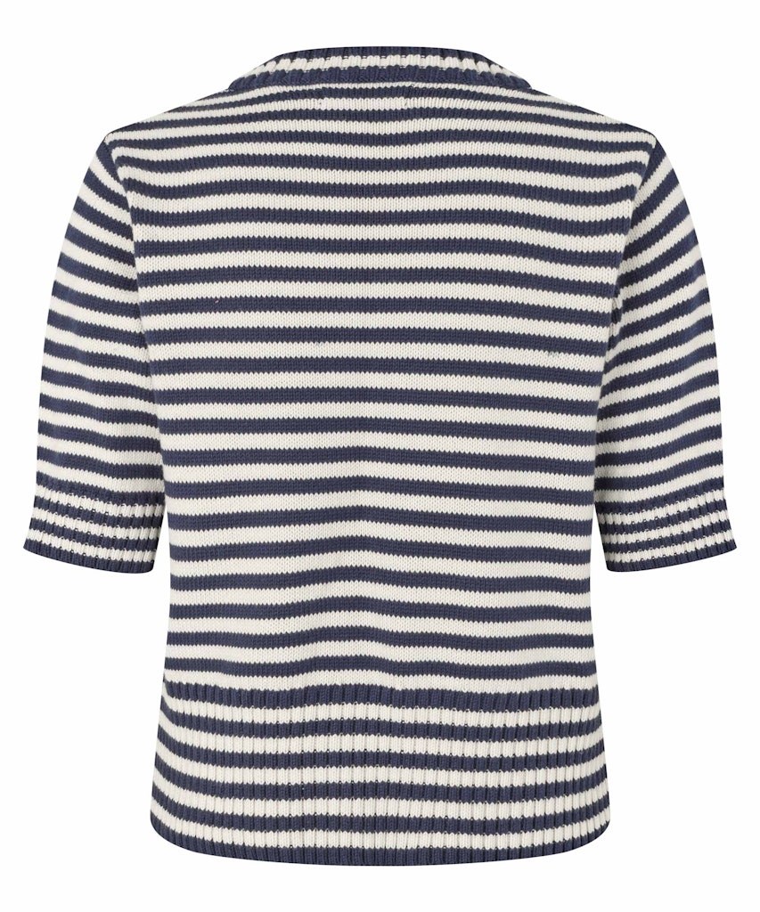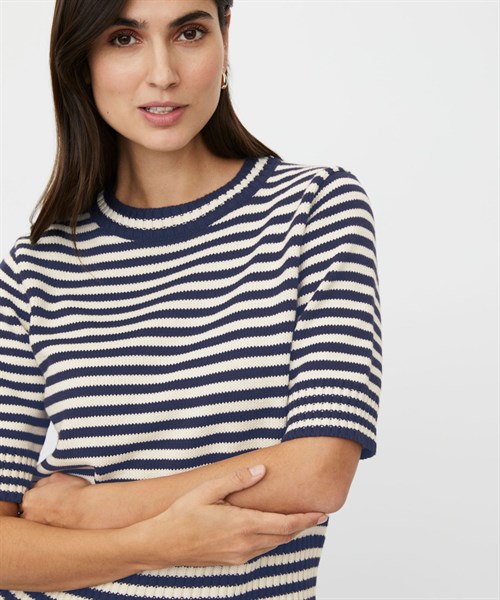 Kortærmet strik bluse i stribet hvid og navy. Blusen er tyk og tung i materialet og sider super flot på kroppen.