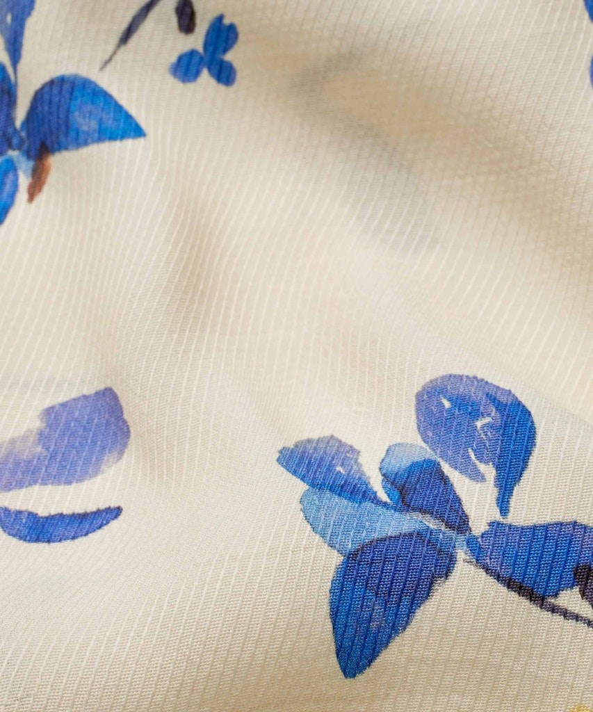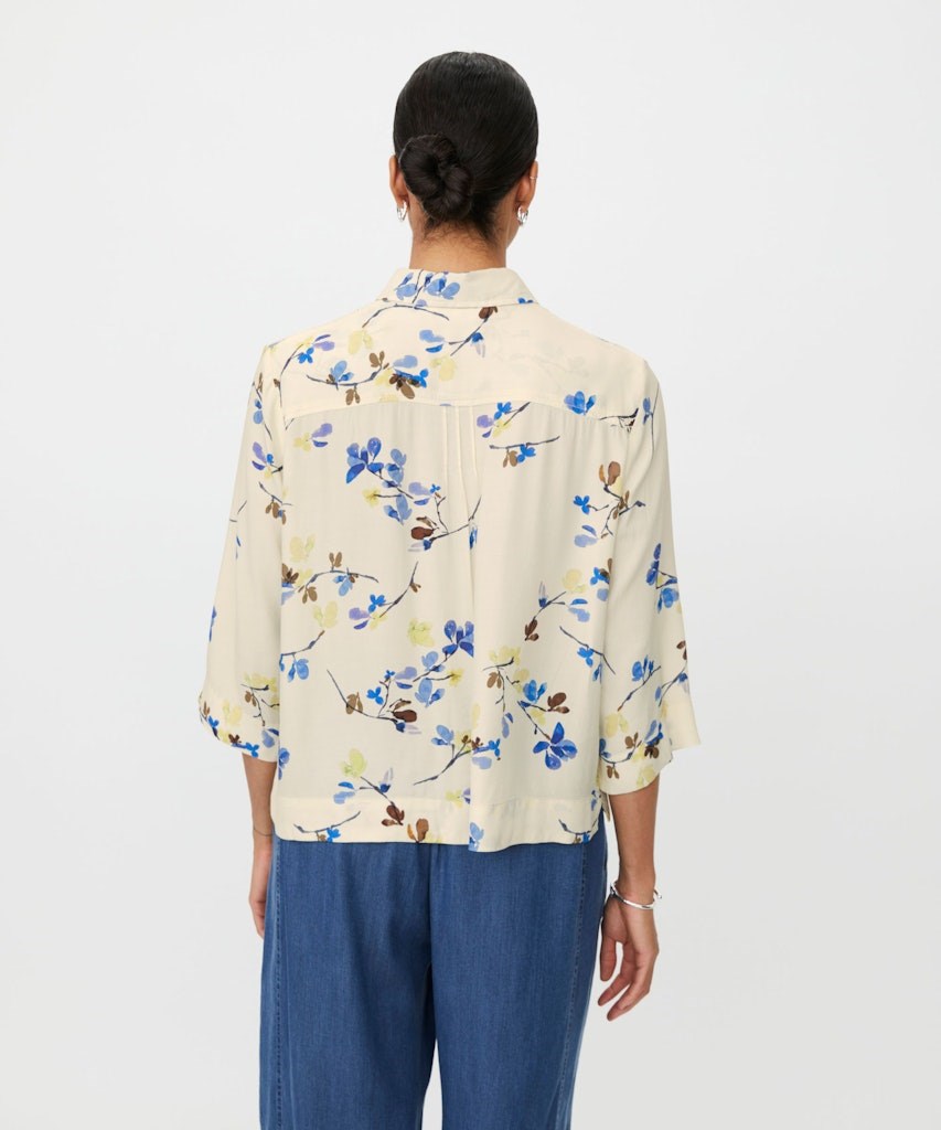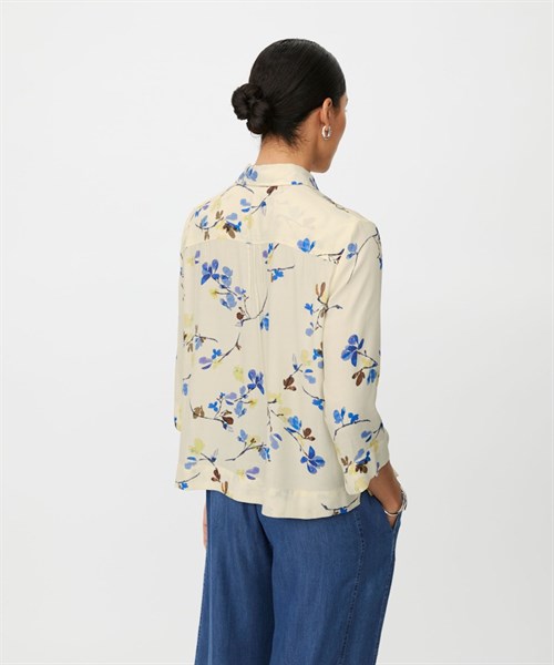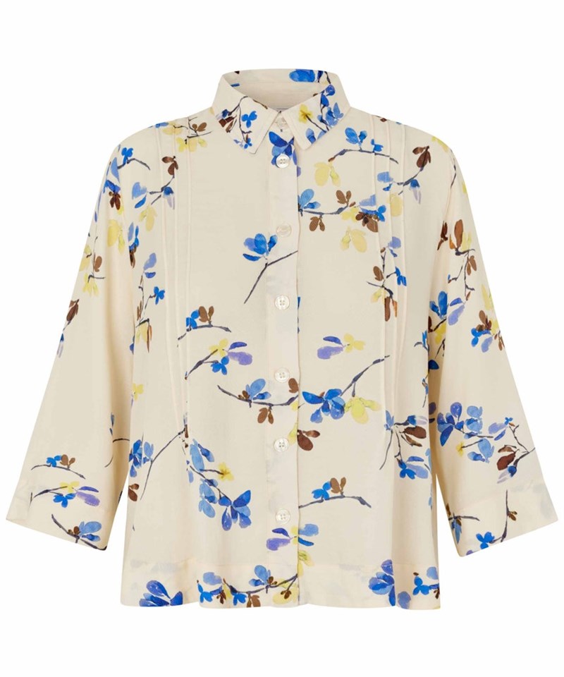 A-shape skjorte bluse i 100% viskose med fine blomster detaljer og 3/4 ærmer. Blusen har krave og knapper hele vejen ned.