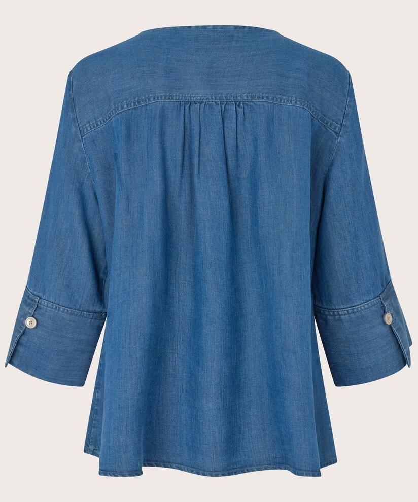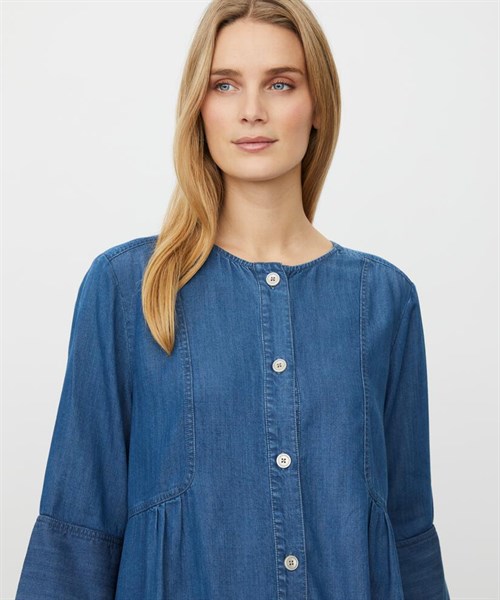 Lækker blød denim skjorte i en A-shape. Skjorten har rund hals og knapper hele vejen ned. Derudover har den brede ærmer og fin knap detalje på ærmet.