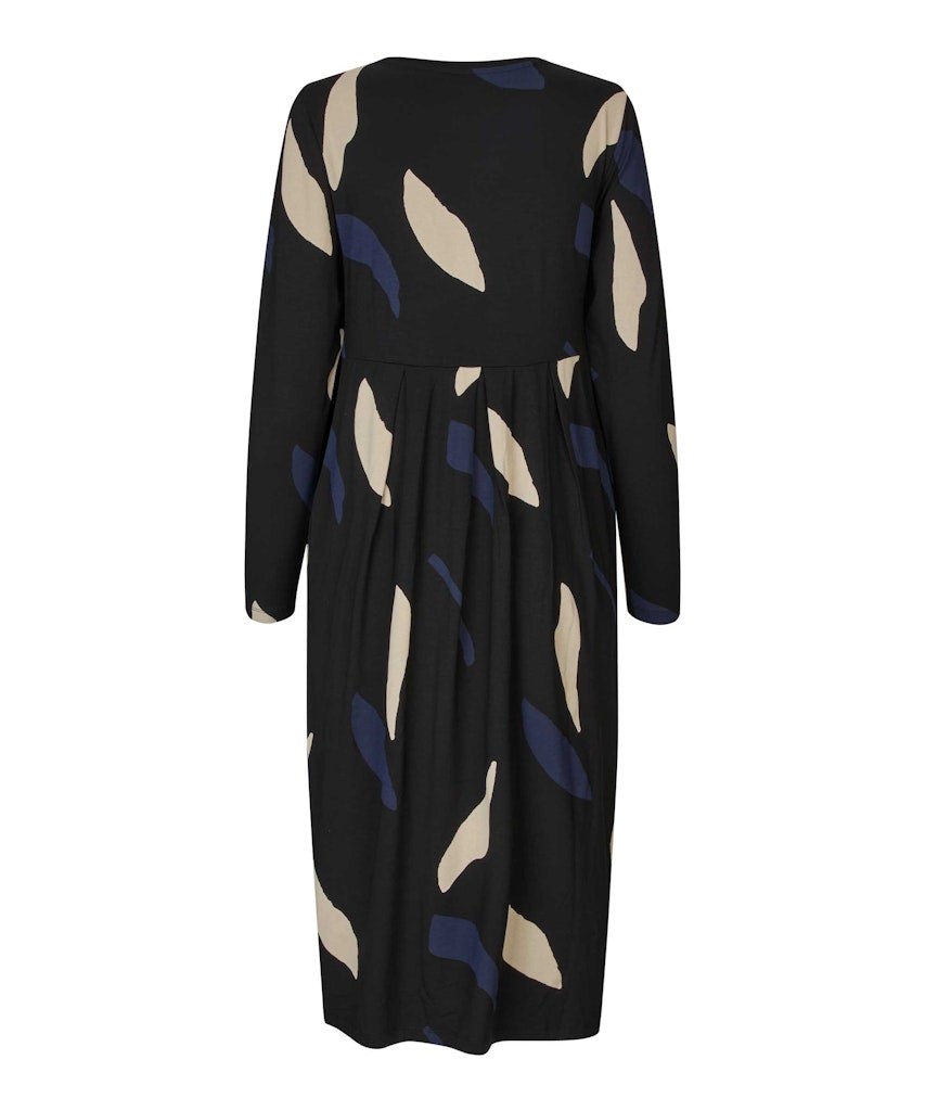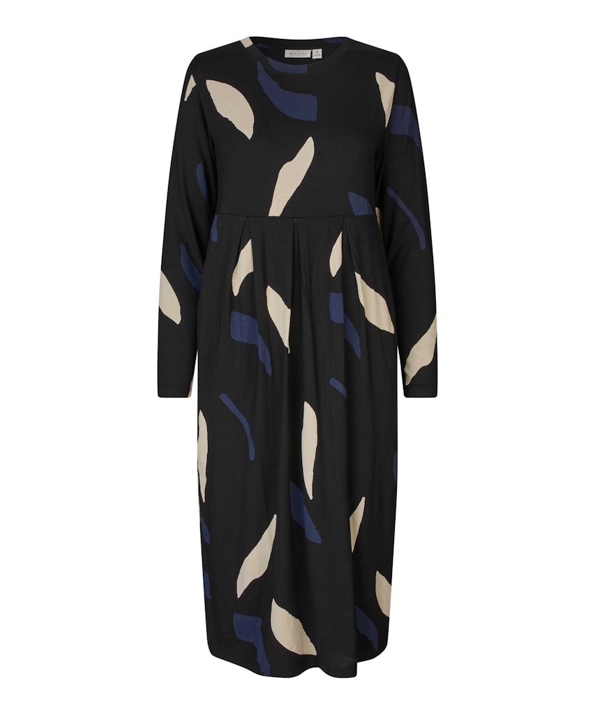 Den populære og klassiske tulipankjole fra Masai, model MaNamo. Kjolen har rund hals og lange ærmer og et smukt grafisk mønster i cremefarvet samt blå. Kjolen er i en lækker blød jersey kvalitet, der falder flot og tungt. Modellen er en shaped model, som får én til at syne slankere. Style den med en støvle og strik for et smukt hverdagssæt eller sæt en fin sko og gør den mere festlig.