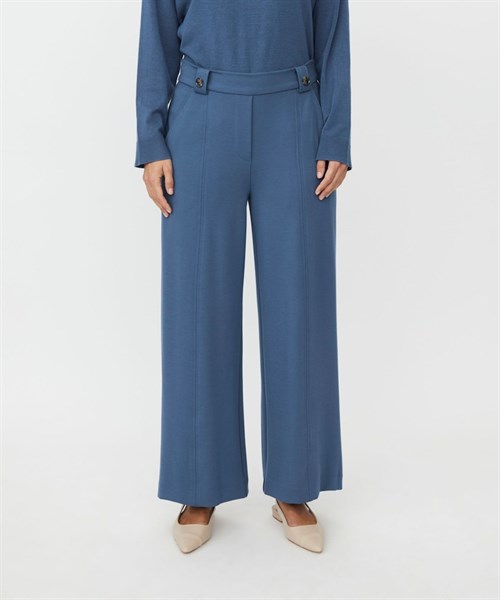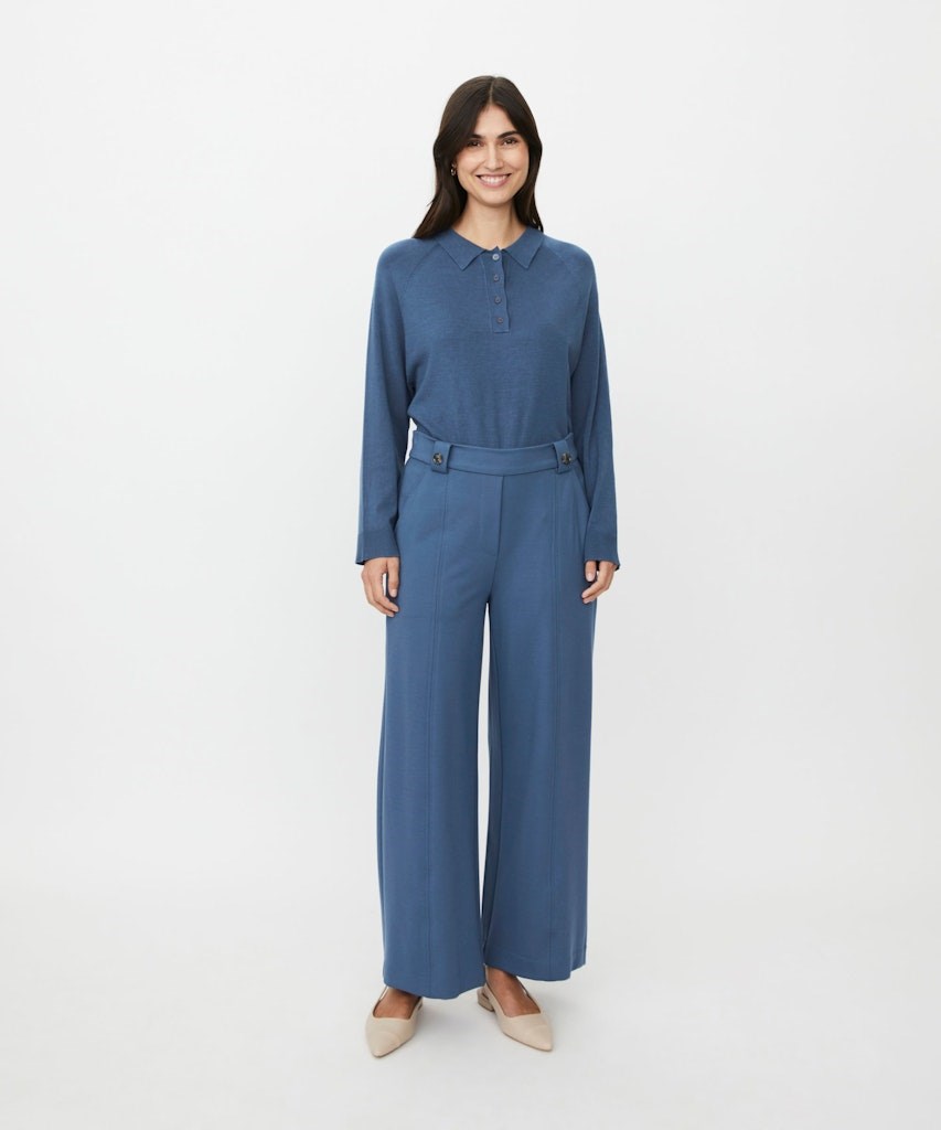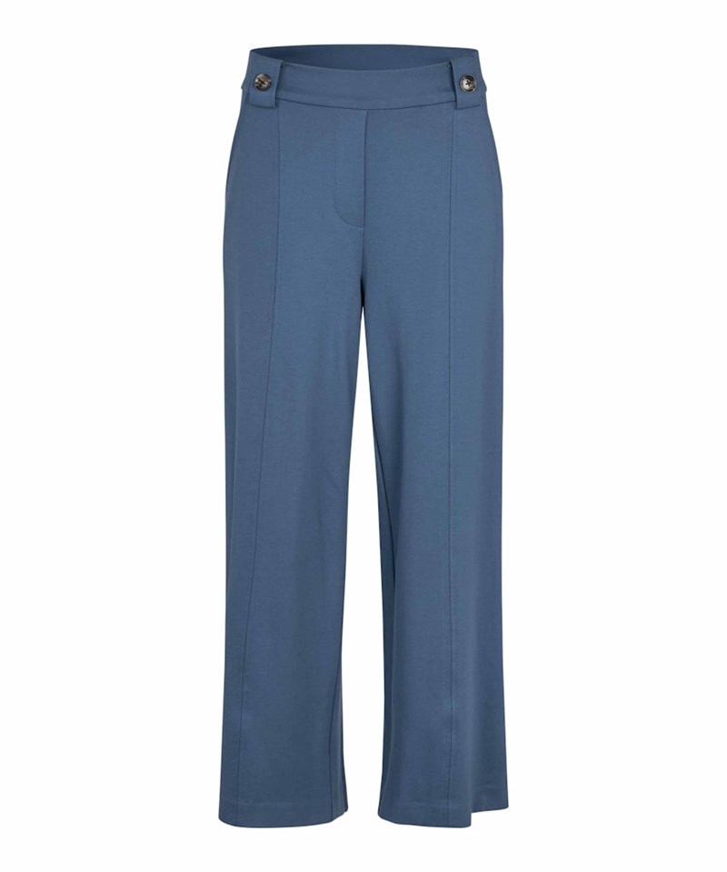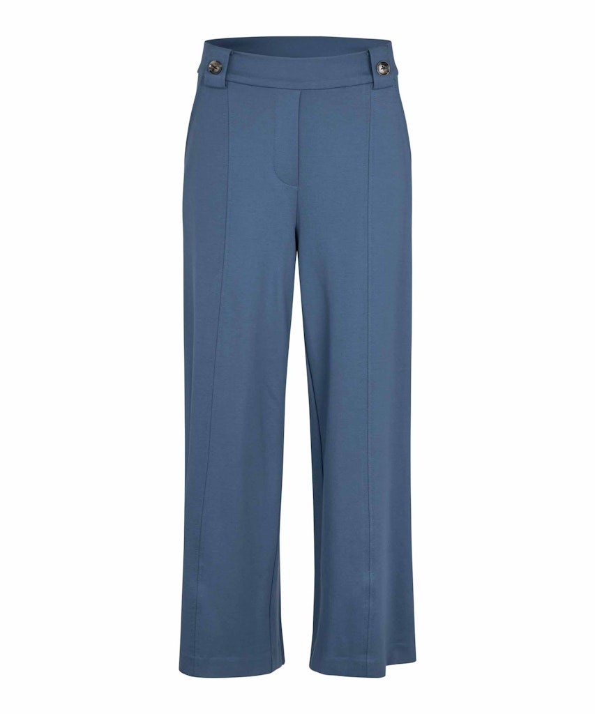 Super lækre bløde vidde bukser med elastik i taljen fra MASAI. Bukserne har to Bælte stropper med fin knap detalje på, og lommer i siderne. Ned gennem bukserne er der en fin syning som fuldender bukserne virkelig godt. Det er en stumpebuks, som giver et virkelig fint og feminint look.