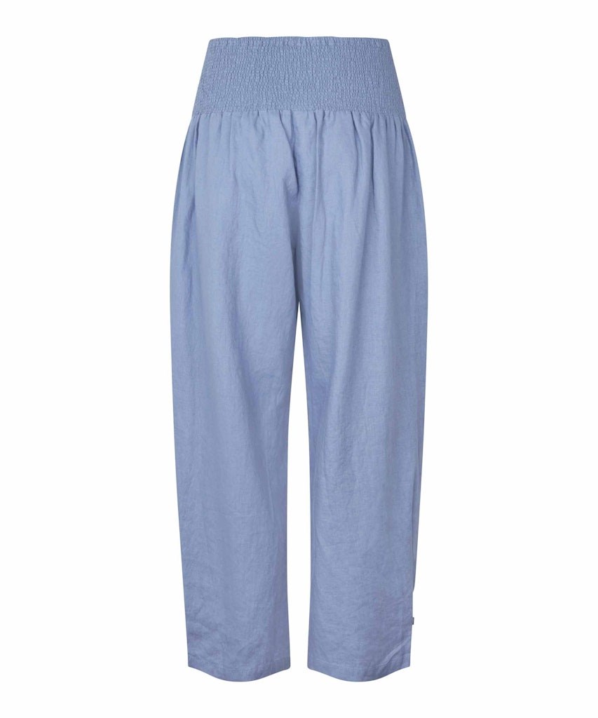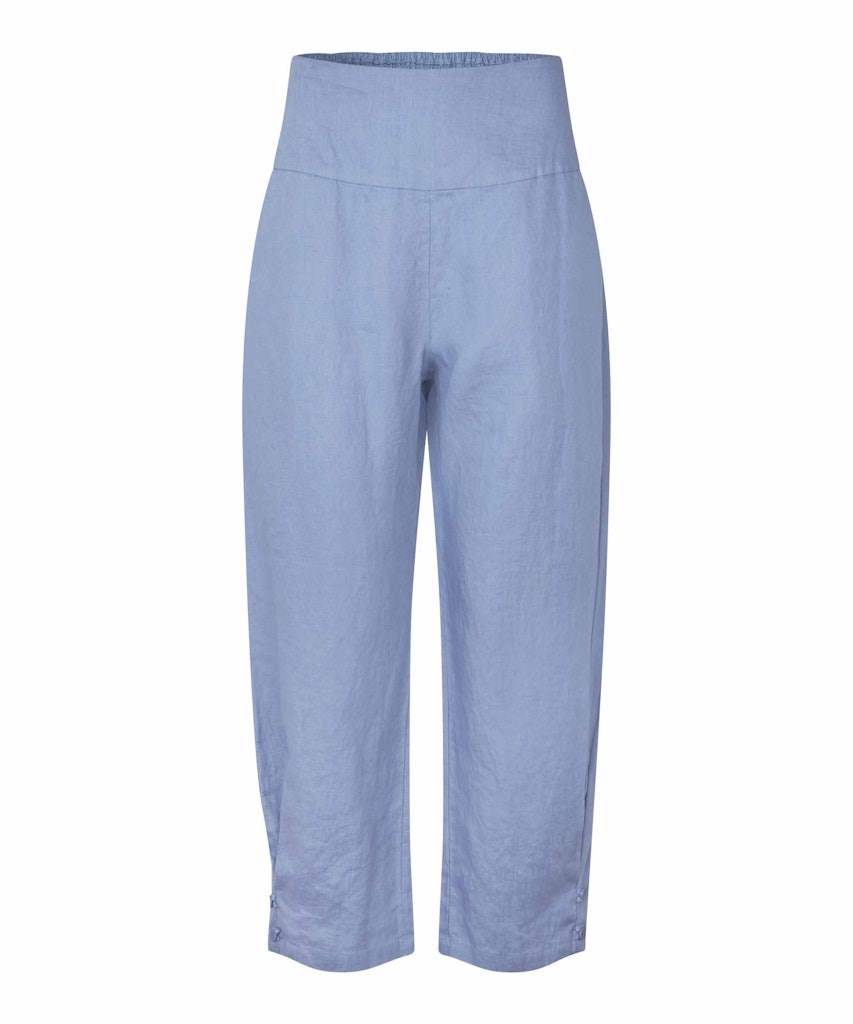 lækre 7/8 del hør bukser i en flot støvet blå farve. Bukserne har fin knap detalje ved anklen og stræk materiale ved taljen.