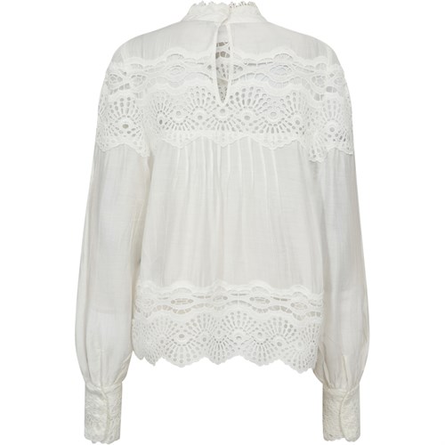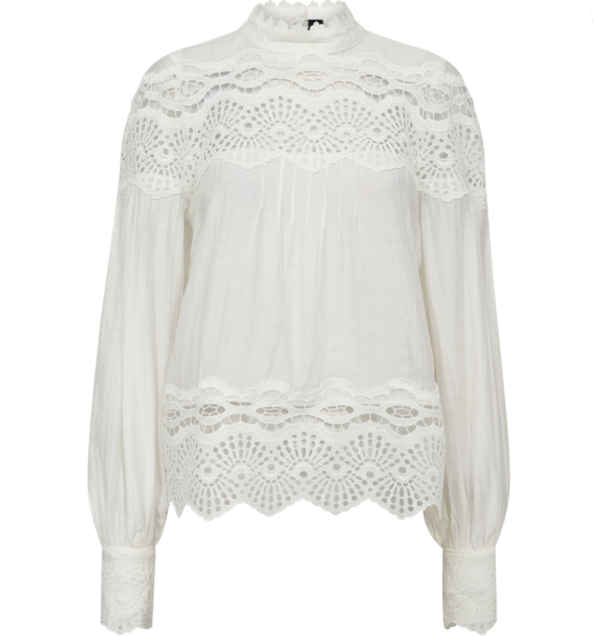 Smuk bluse med fine broderi detaljer på ærmerne, kragen og bunden af blusen. Virkelig elegant og perfekt til en fin anledning til et par flotte habitbukser.