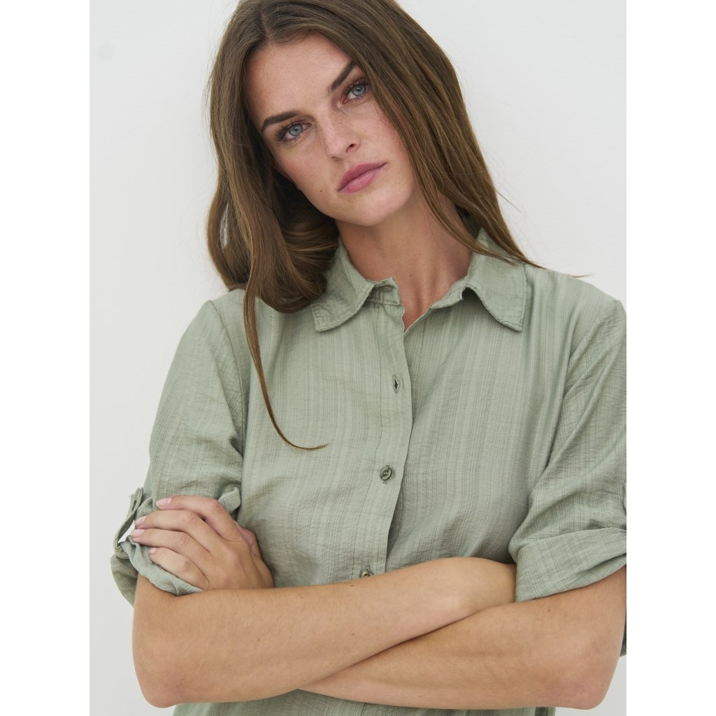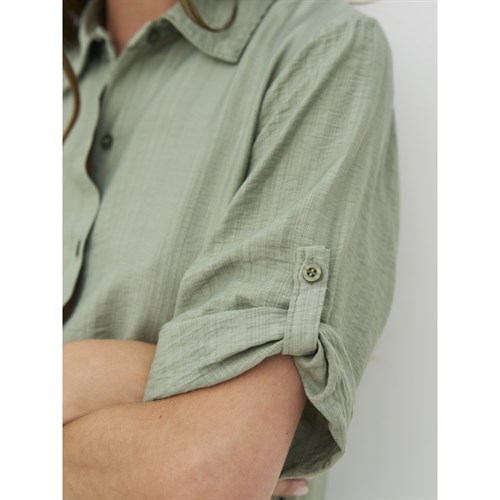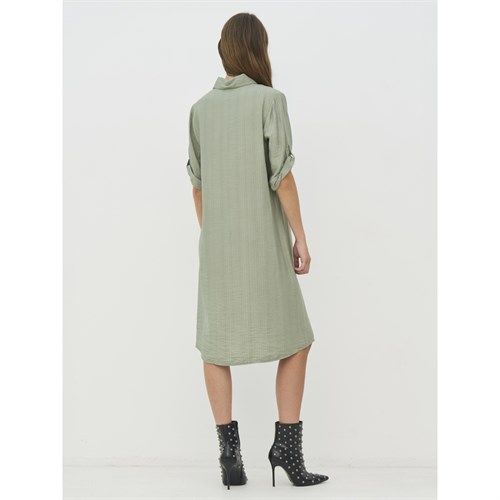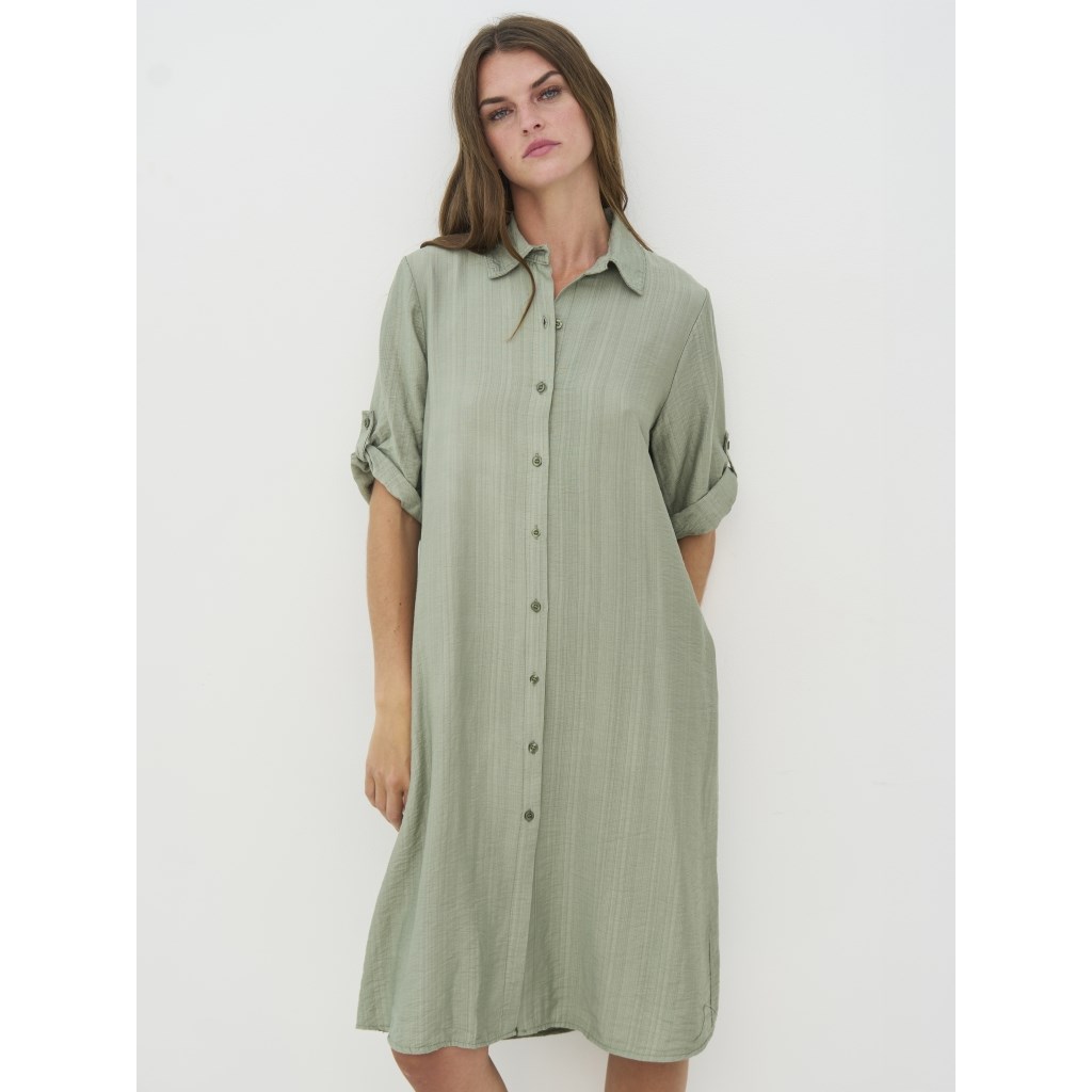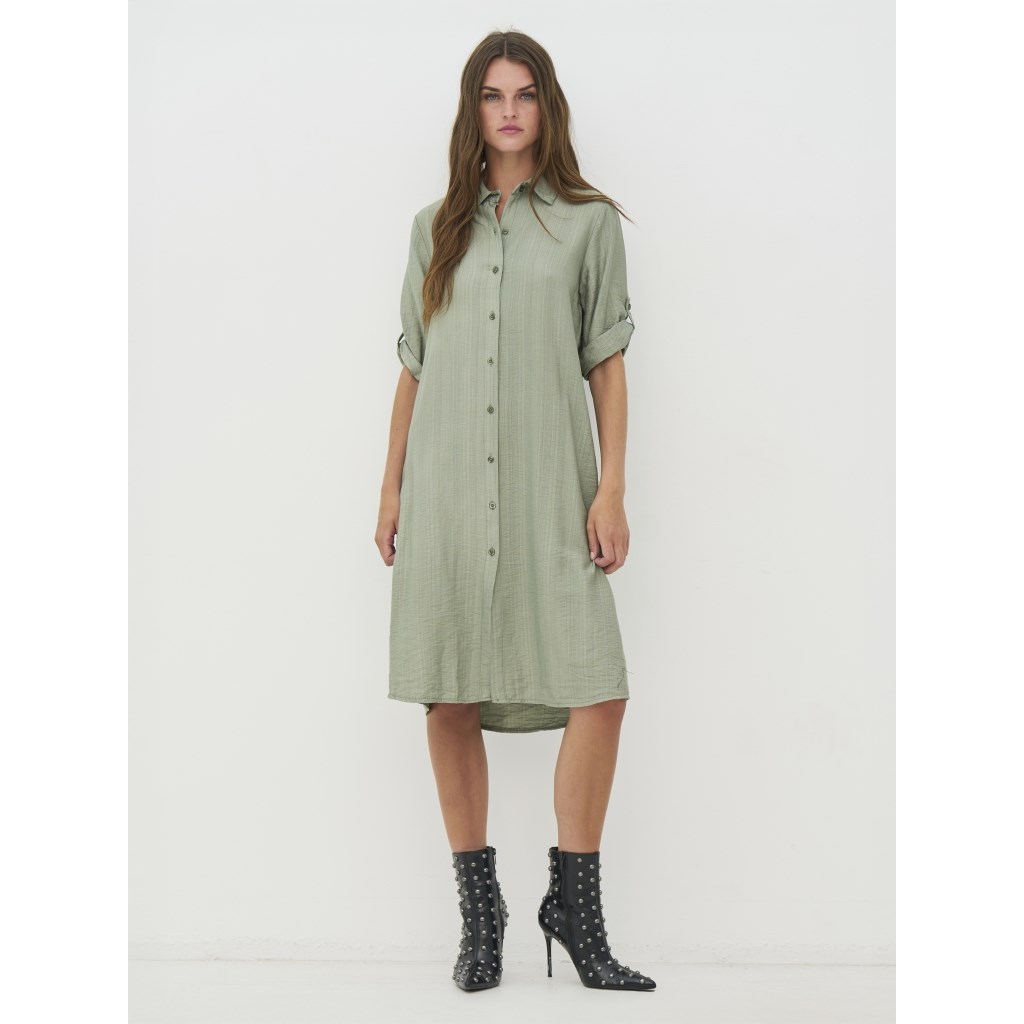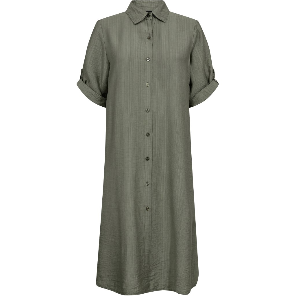 Lækker viskose kjole med korte ærmer i en smuk grøn farve. Kjolen kan foldes op ved ærmerne, og har knapper hele vejen ned.