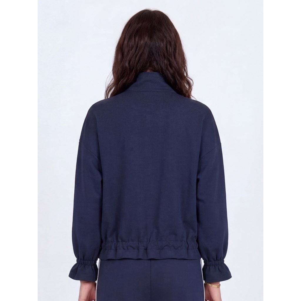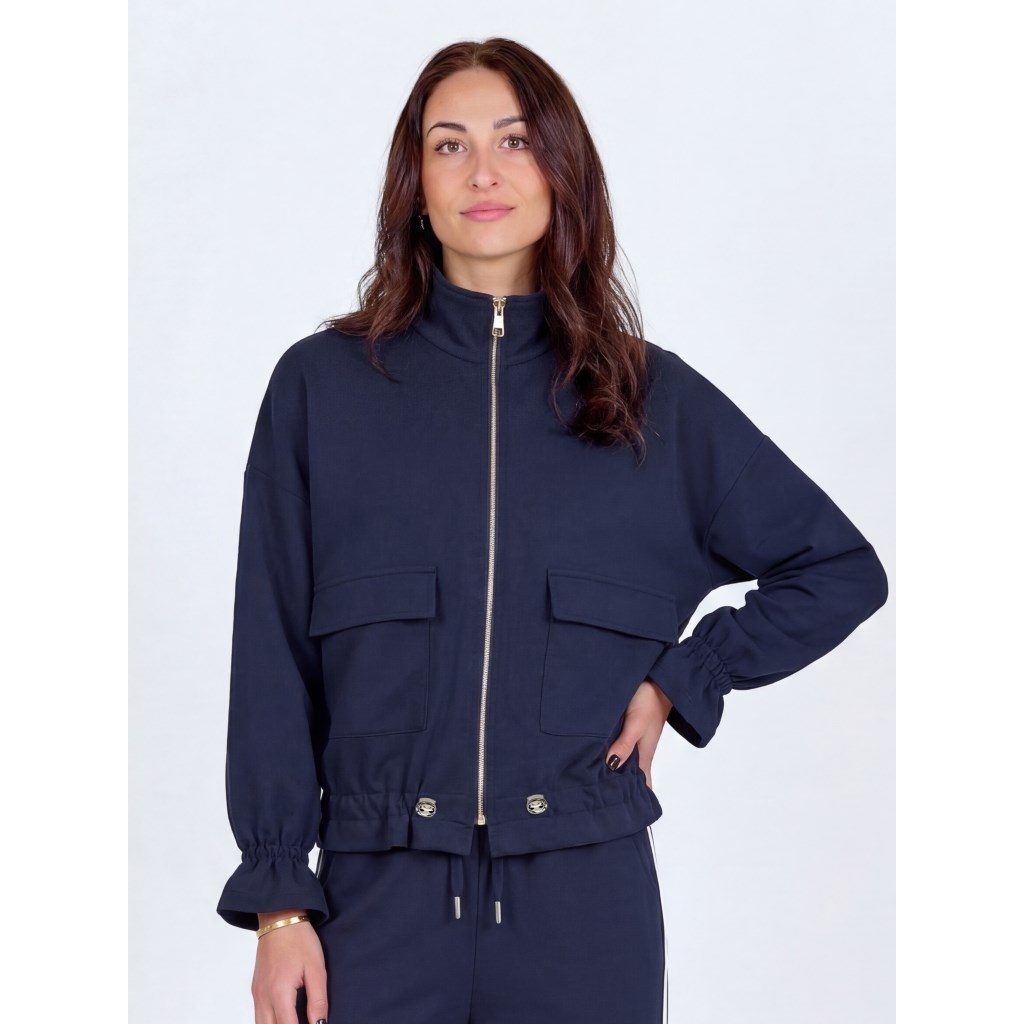 Smuk jakke/ Cardigan med fine ærmer der går lidt ud for neden. Jakken lukkes med lynlås og har elastik bånd forneden som kan justeres alt efter looket.