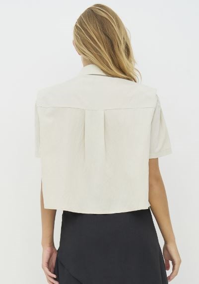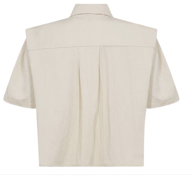 Super flot kort skjorte/jakke med et moderne snit fra NÜ Denmark. Skjorten er med korte ærmer, som har skulderpuder der giver et flot look, samt almindelig skjorte krave. Foran er der små enkle trykknapper, der giver et ekslusivt look, Skjorten har et