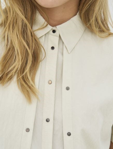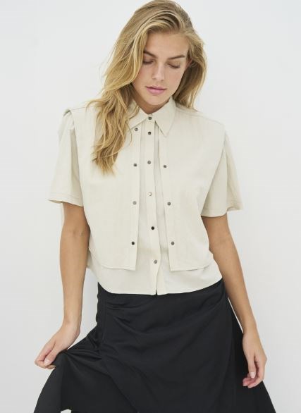 et ekstra lag foran, så det ser ud som om man har en vest over, en ret flot detalje der giver lidt blikfang. Brug skjorten åben med en top under, eller lukket som en lille jakke til et par bukser eller over en kjole. Pasformen er lige op og ned, og skjorten har et boxet look.