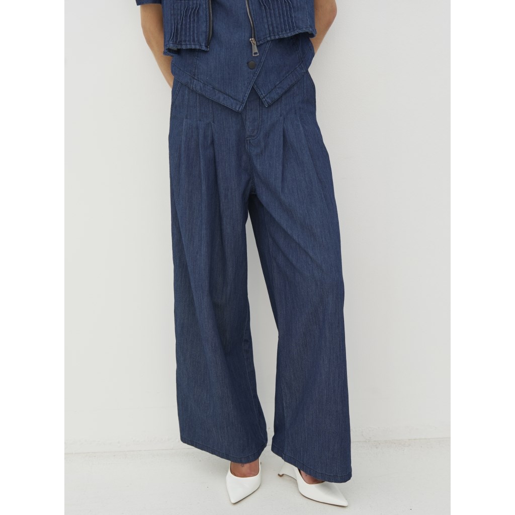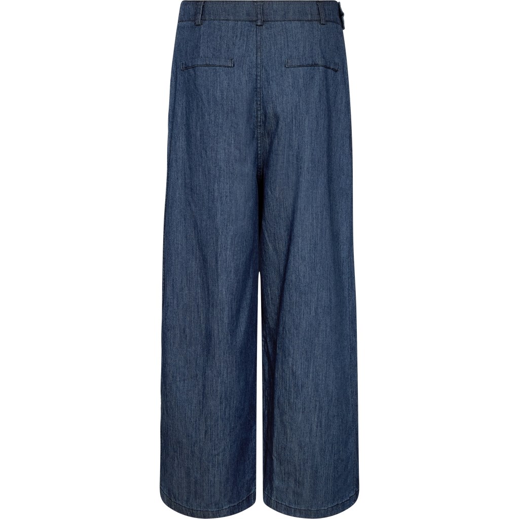 Lækre vidde bukser i blød denim. Bukserne har en fin detalje med skrå knappe lukning i livet.