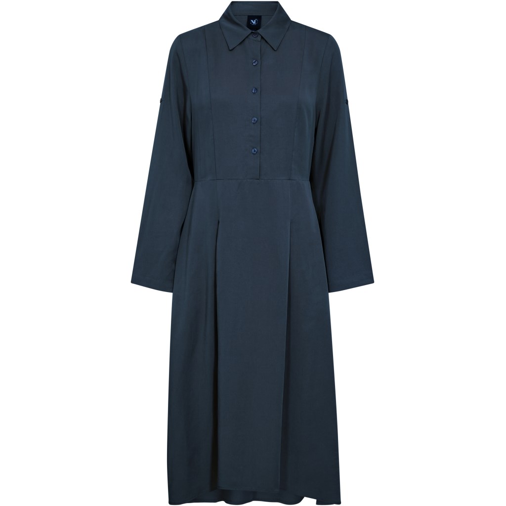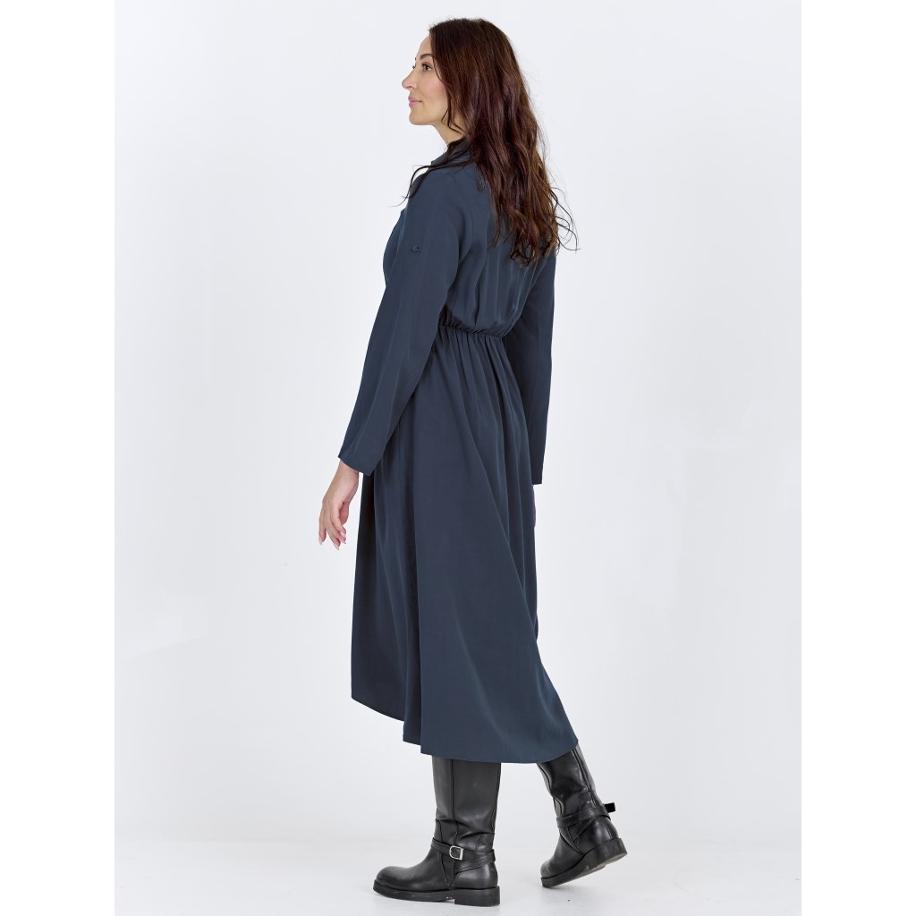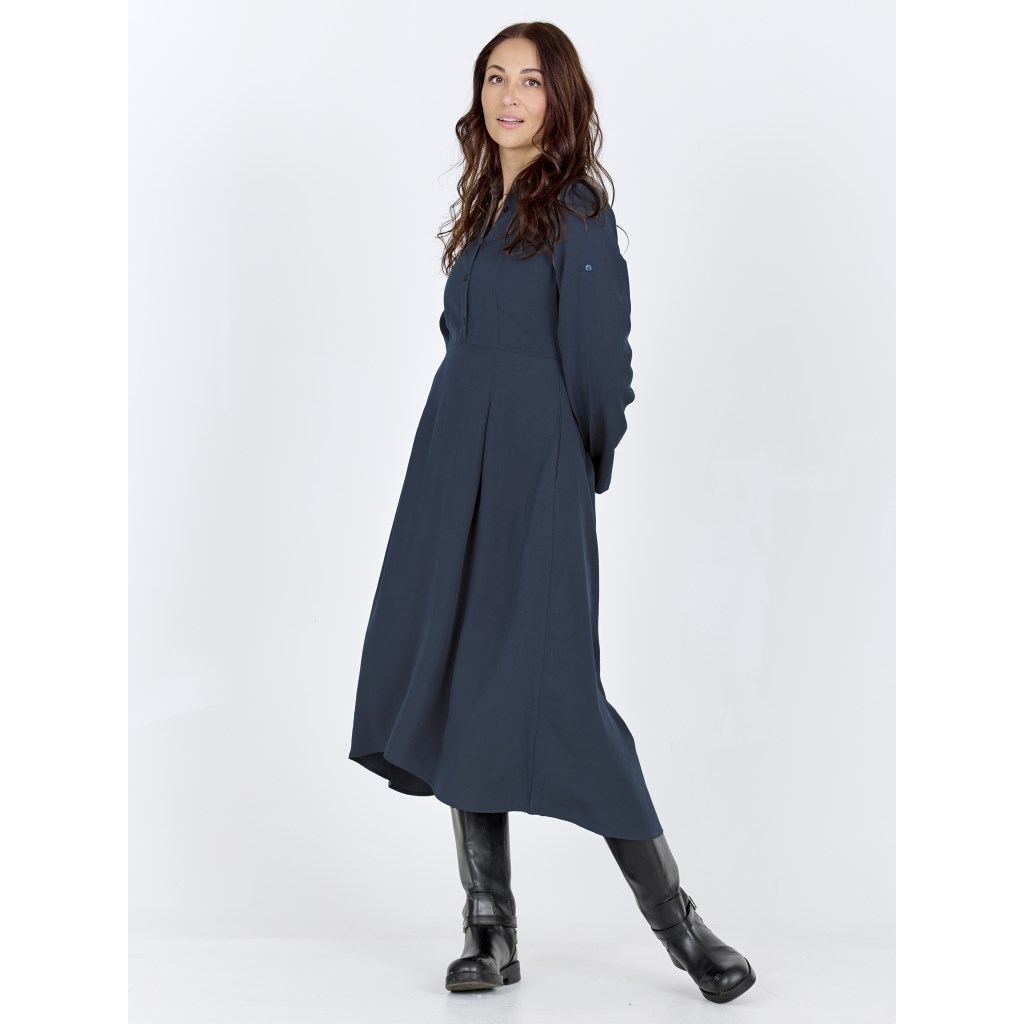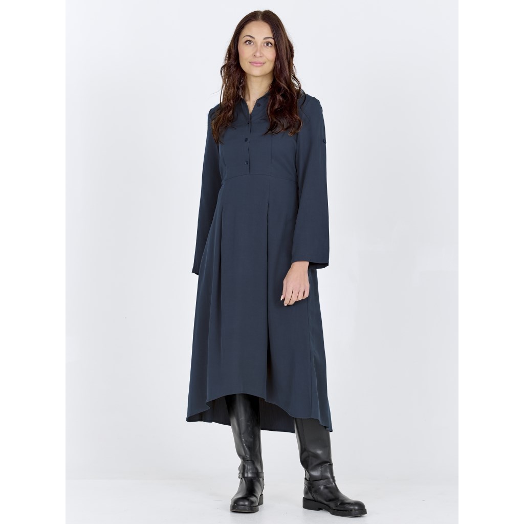 Virkelig flot lang mørkeblå kjole. Kjolen har krave, og knapper ned til midt på maven. Bag på har den elastik bånd, som gør den virkelig behagelig at have på. Ærmerne kan smøges op, hvis ønskes. Kjolen er en smugle længere bag til en foran, og har fine plisseringer.