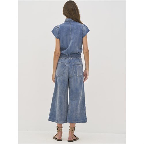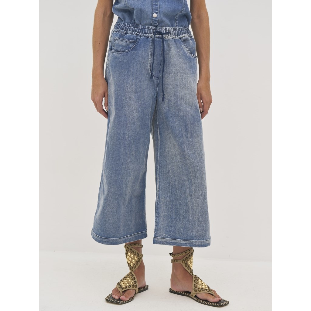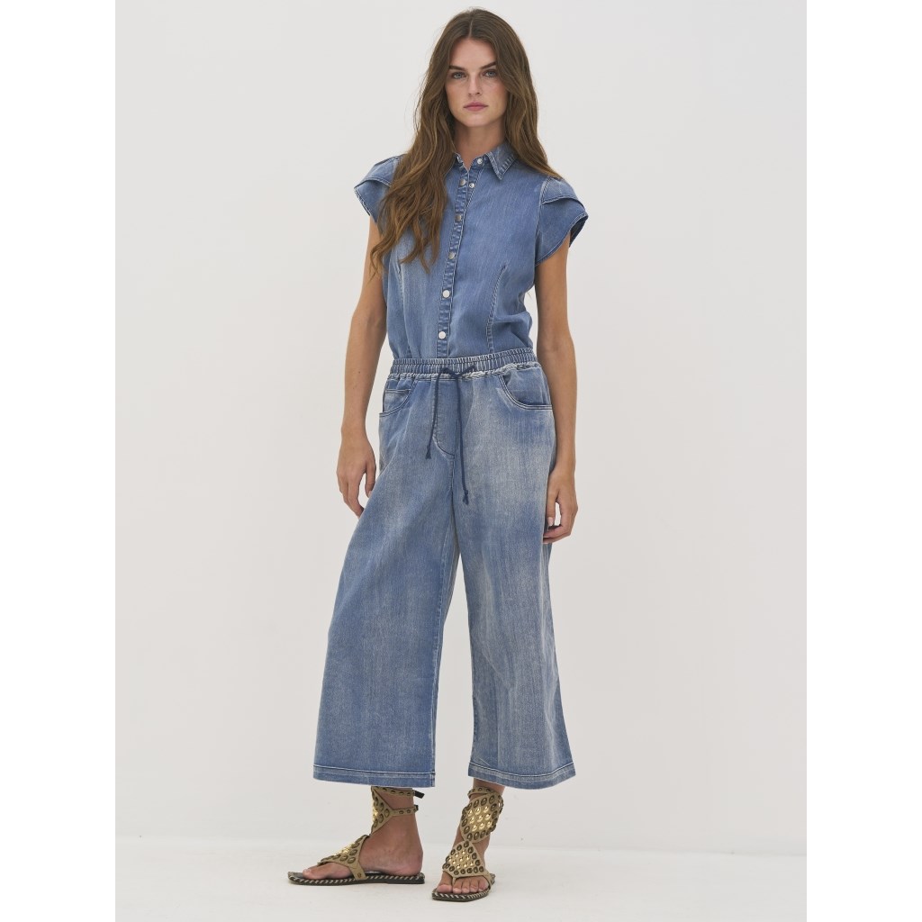 Denim culotte bukser med vidde ben og elastik med bindebånd i taljen. Style dem for sig selv, eller sammensæt dem med den matchene skjorte bluse.
