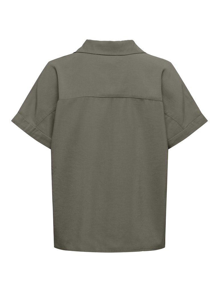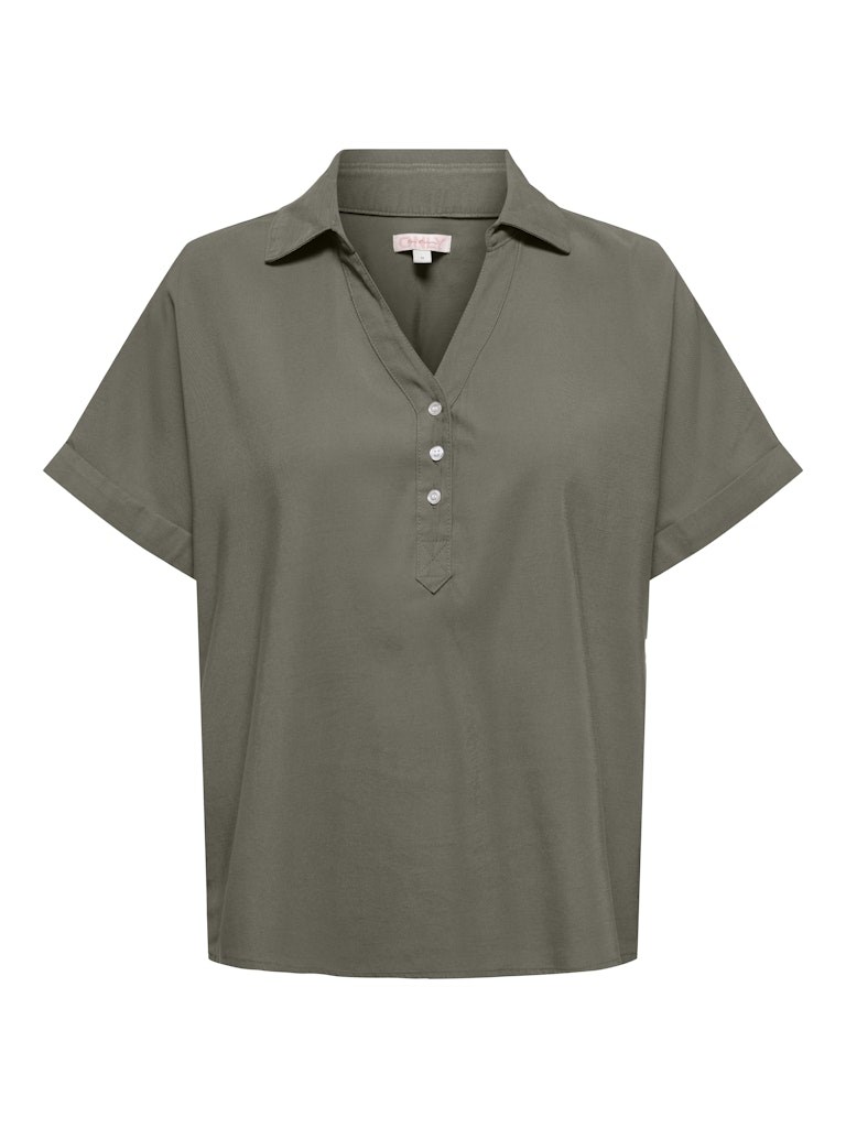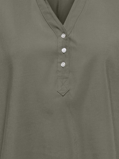 Lækker blød bluse med kort ærme fra Only. Blusen har kort ærme og stolpelukning med 3 knapper foran. Blusen er i en meget lækker blød viskose og har en smuk støvet grøn farve. Style den med de matchende stumpebukser eller et par løse hør bukser.