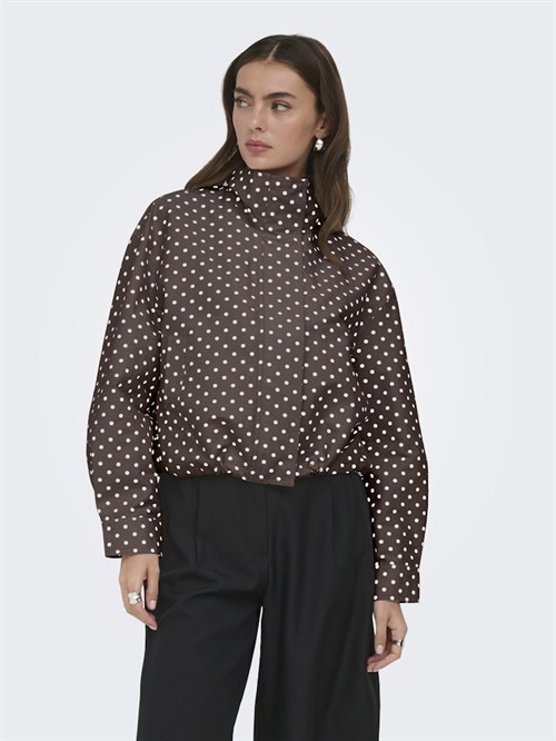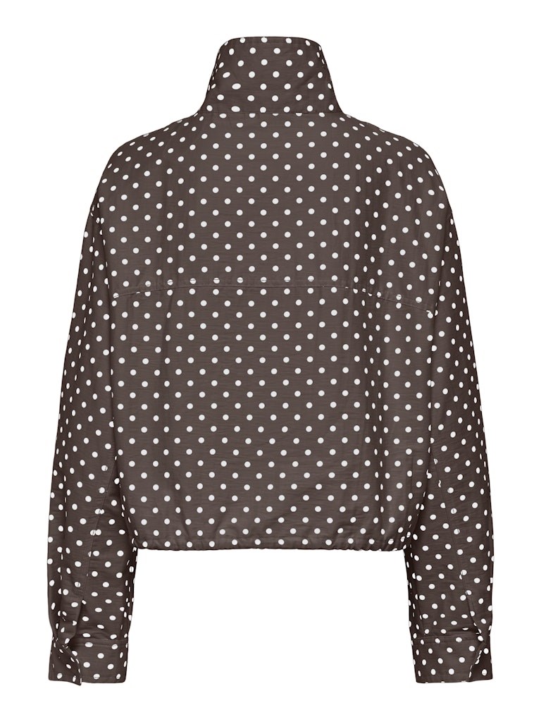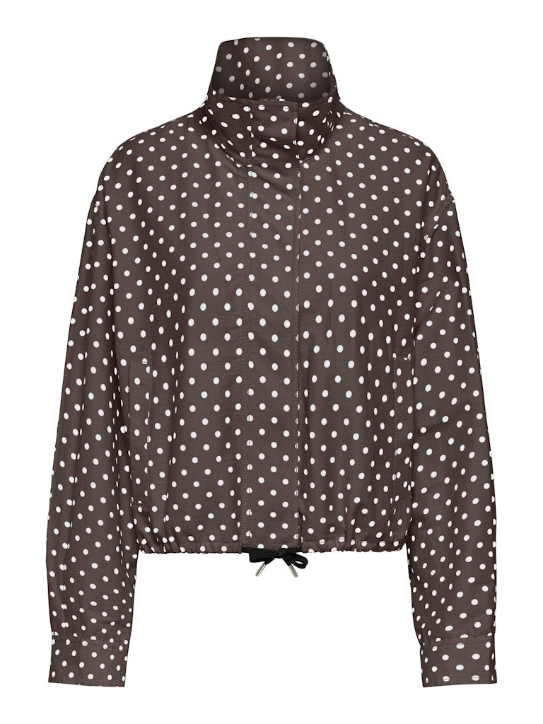 Mega cool jakke i brun med hvide prikker. Jakken er kort i modellen og har snøre som kan stramme den ind i taljen. Jakken er højhalset og lukkes med lynlås.
