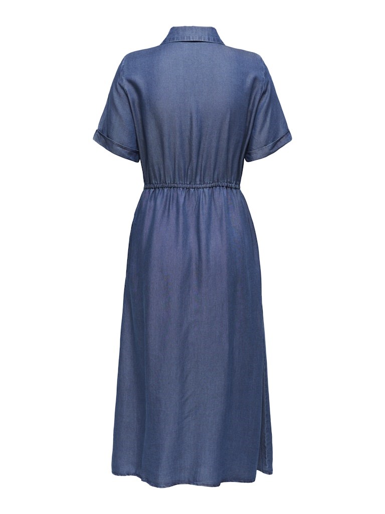Blød denim kjole med skjorte krave og knapper, bindebånd i taljen. Kjolen har korte ærmer og går ca. til midt på skinnebenet.