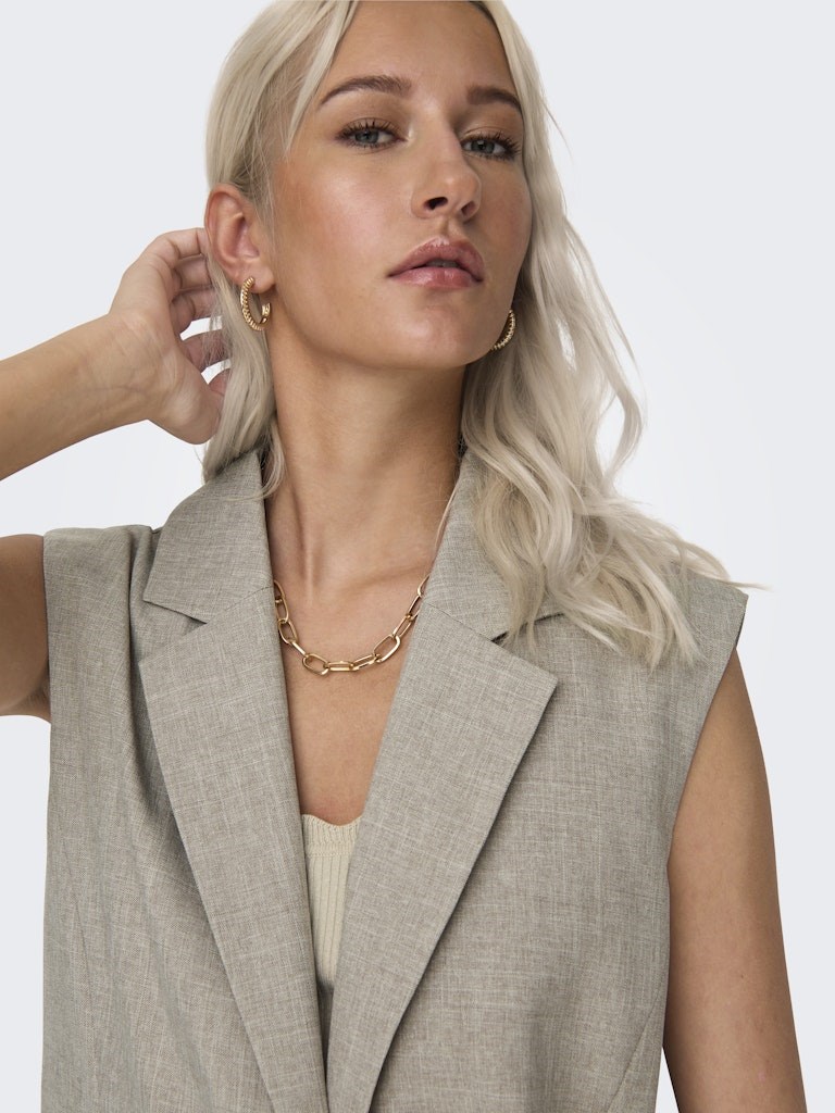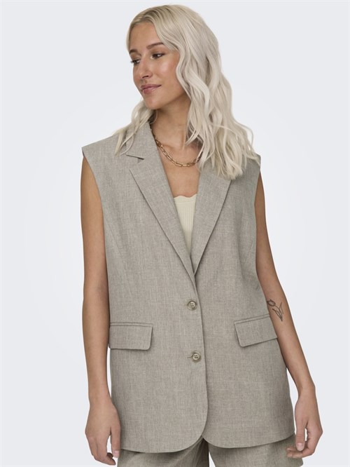 Cool oversize vest i en smuk meleret kvalitet fra Only, model Linda. Vesten har en smuk revers og lukkes foran med 2 knapper. Foran er der 2 snydelommer og bagpå er der slids nederst. Vesten har satin for indvendig, så den glider let over andre materialer. Style den med en top under på lune dage eller brug den over en basisbluse for et cool hverdagslook.