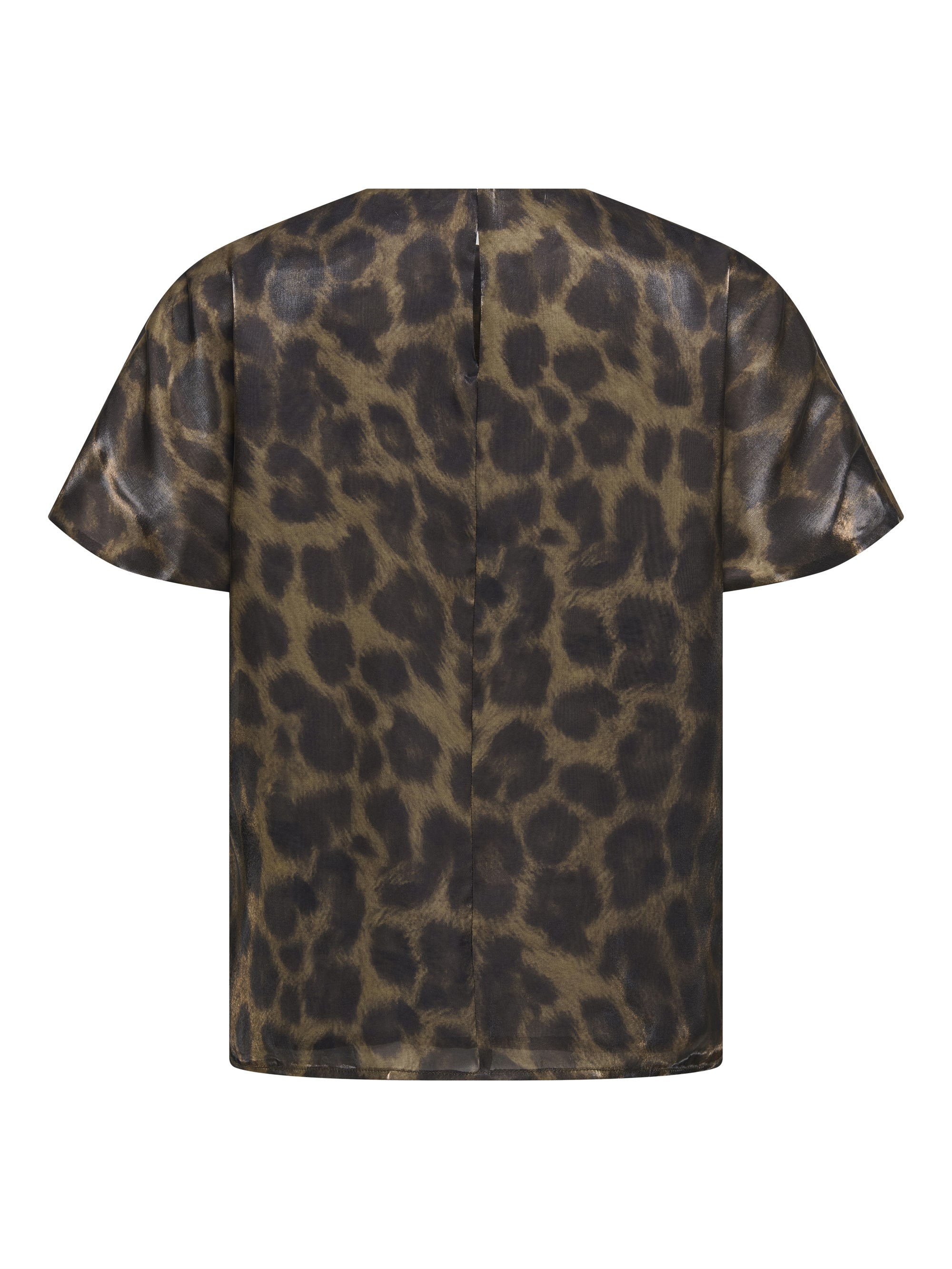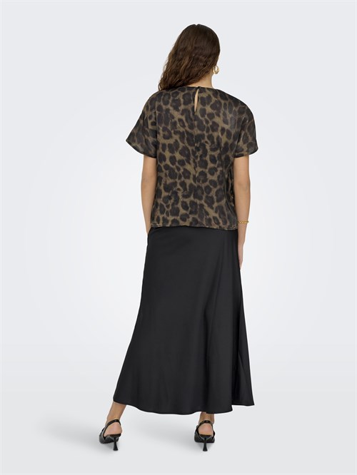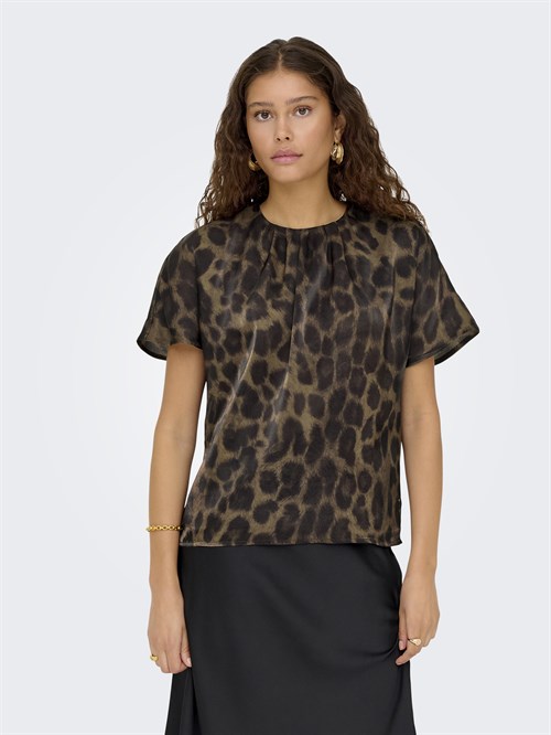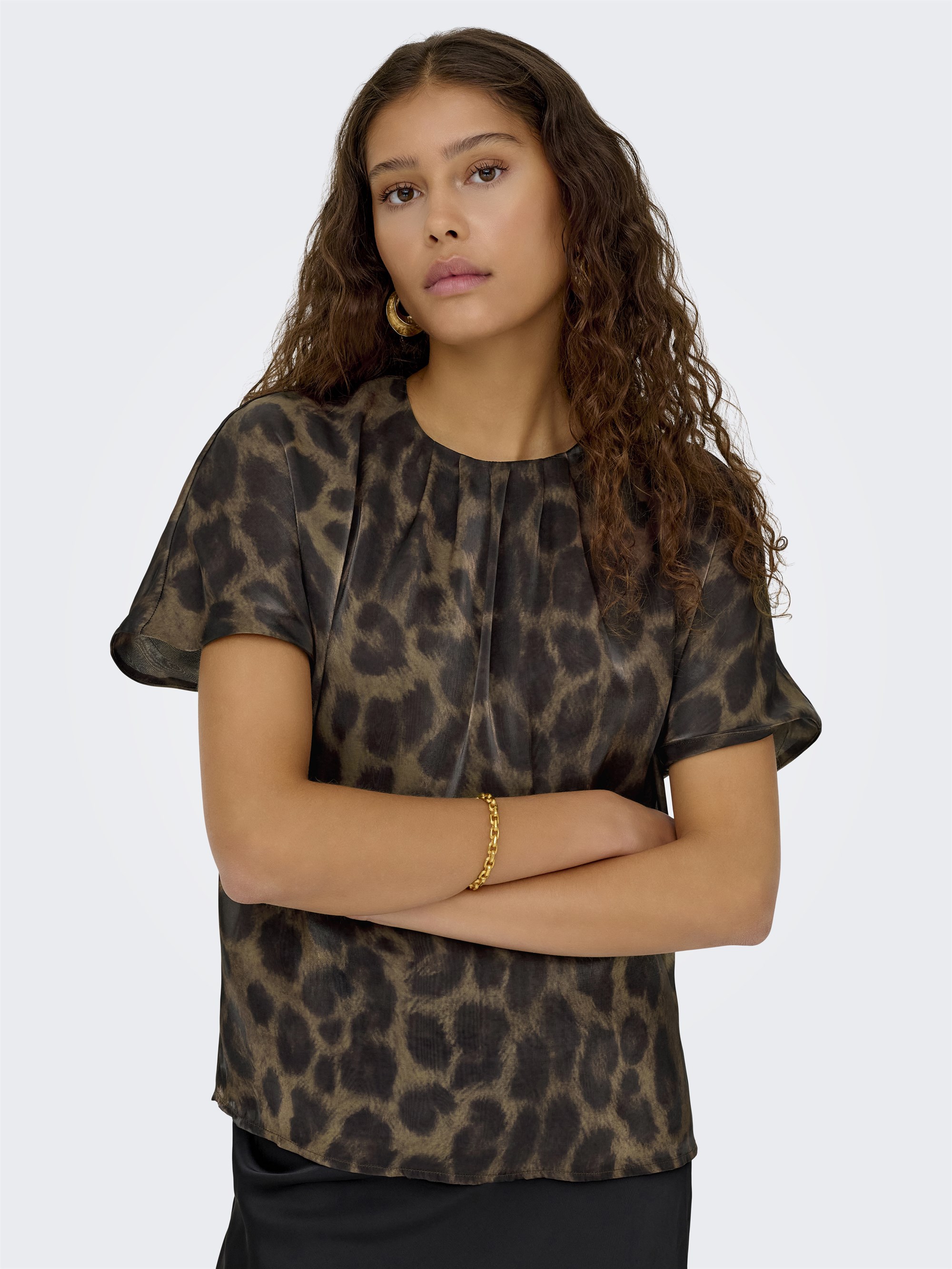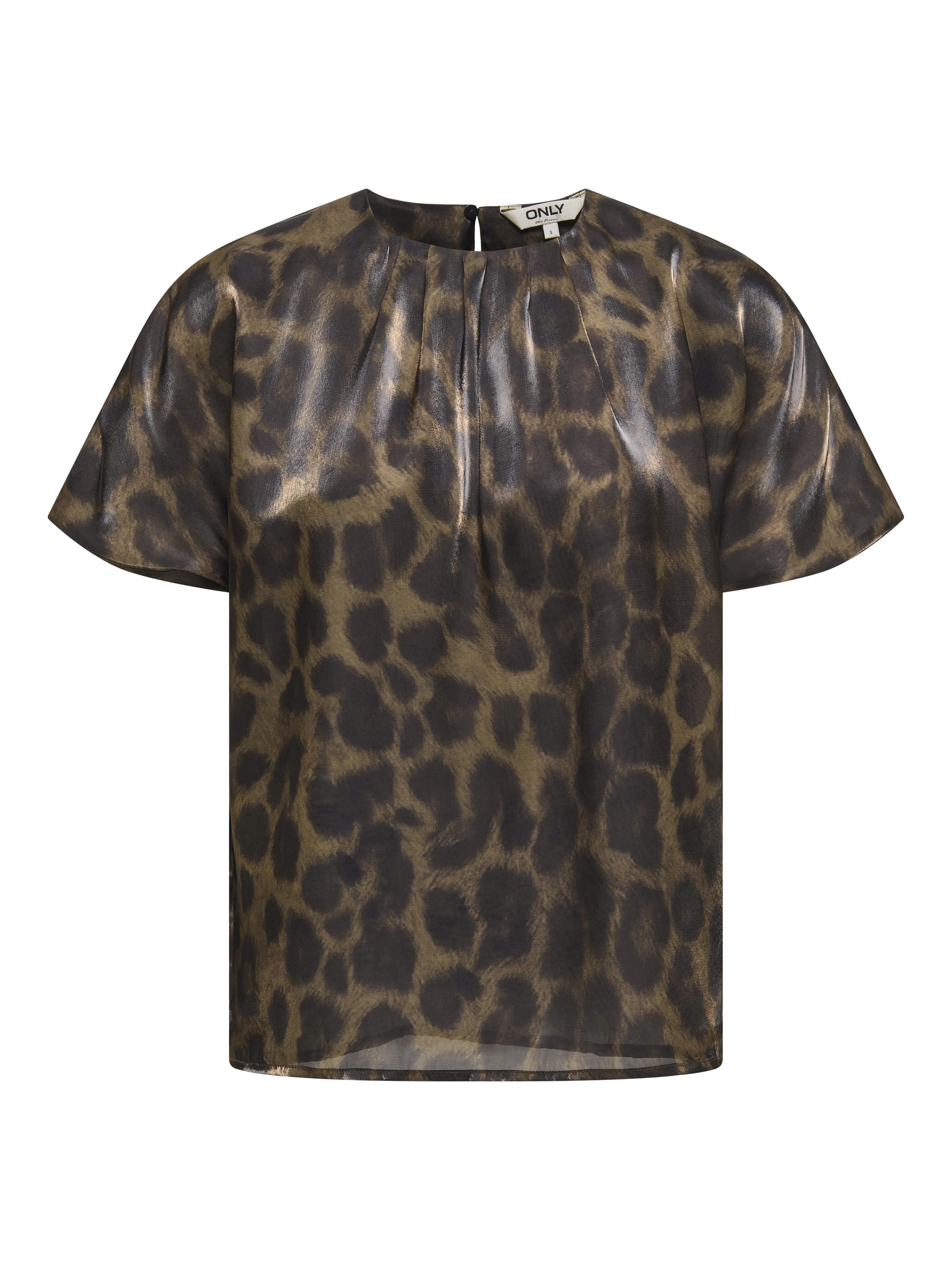 Smuk og festlig top model Stella fra Only. Toppen har et kort bredt ærme, der falder ud over skulderen, rund hals med knaplukning og lille åbning i nakken. Foran ved halsen er der små fine læg, der giver den et feminint touch. Stoffet er med stort leopardprint i mørkebrun og sort, der skinner på en eksklusiv måde. Style den til en festlig aften med en nederdel eller sorte bukser og en høj hæl.