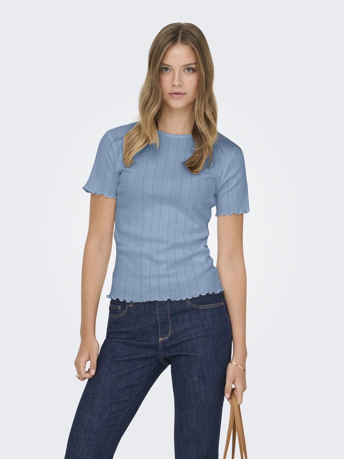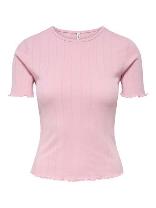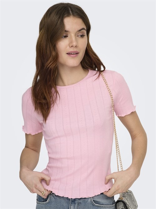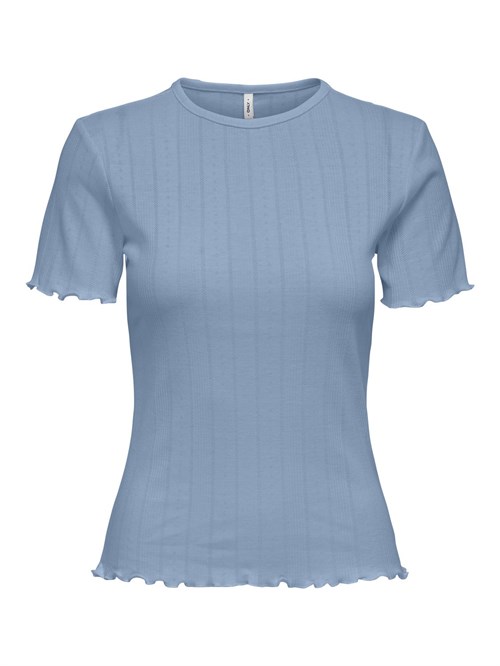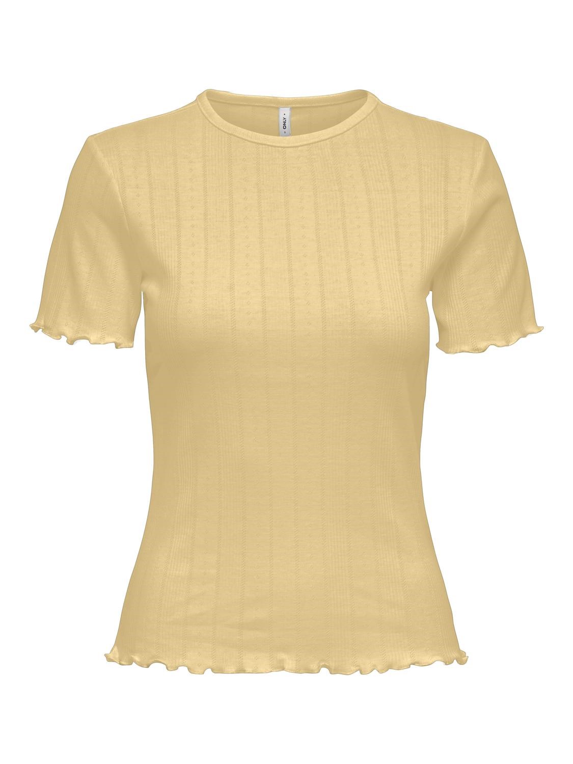 Sød t-shirt med et feminint hulmønster fra Only. T-shirten har rund hals og et lille kort ærme der har en lille krøllekant. T-shirten er ikke lang, så skal sidde udenpå bukser, nederdel osv. Style den til et par cool jeans og en strik for et lækkert hverdagssæt.