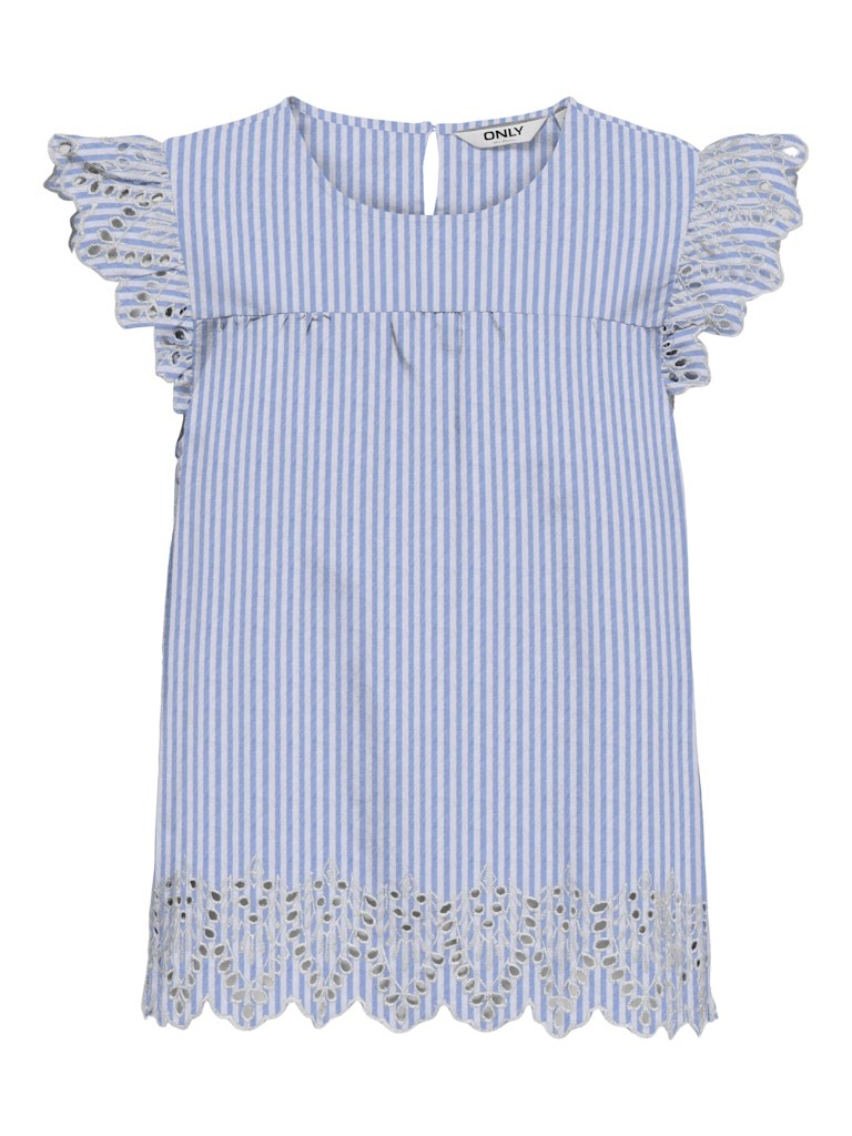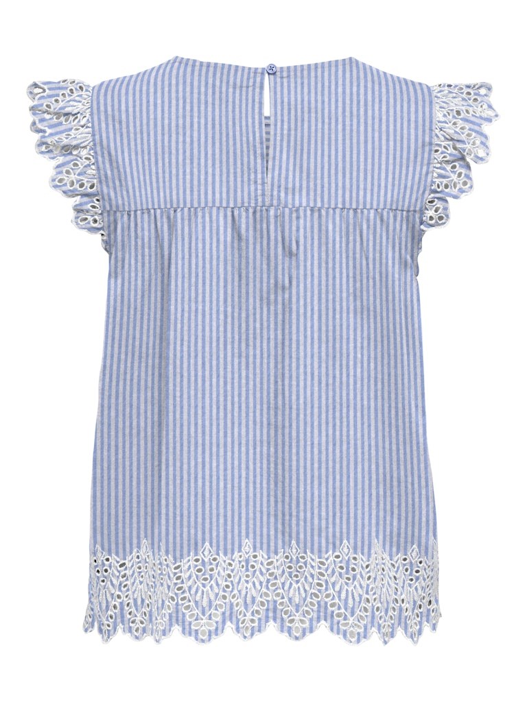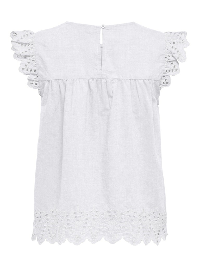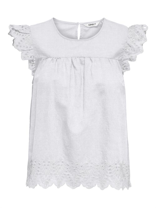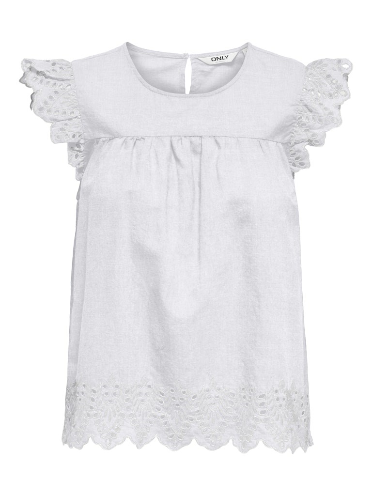 Sød top fra Only med de fineste broderi anglaise kanter ved ærmer og i bunden. Fås i 3 farver. En virkelig sød sommertop i bomuld. Style den til et par løse bukser eller en denim nederdel.