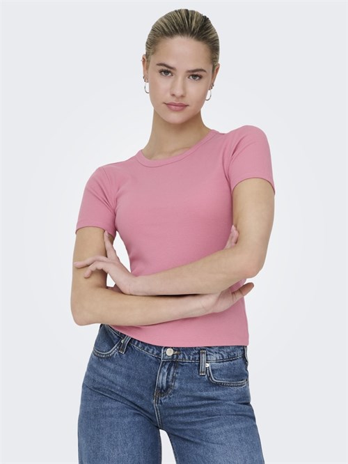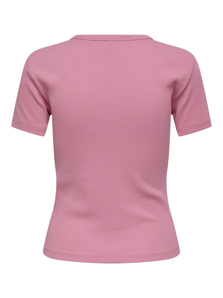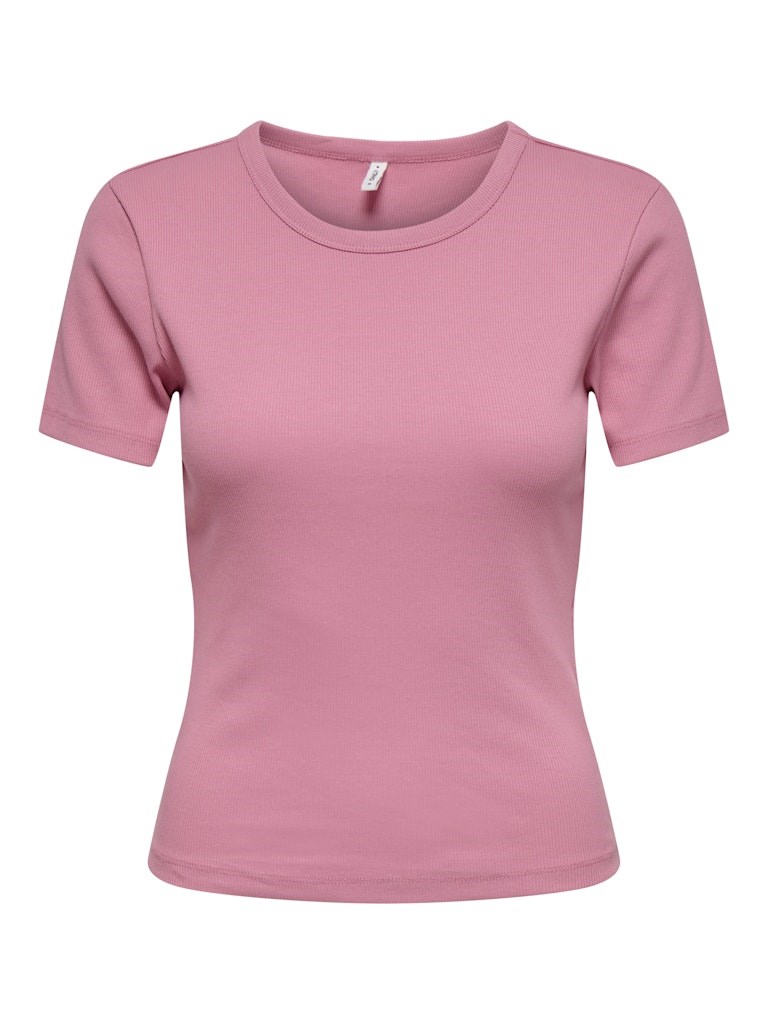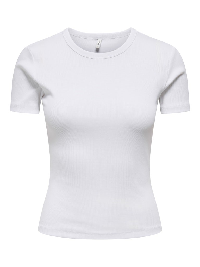 Lækker blød t-shirt i ribkvalitet fra Only. T-shirten har rund hals og kort ærme. Modellen er tætsiddende, men har masser af stretch. Style den under en blazer eller bare som den er.