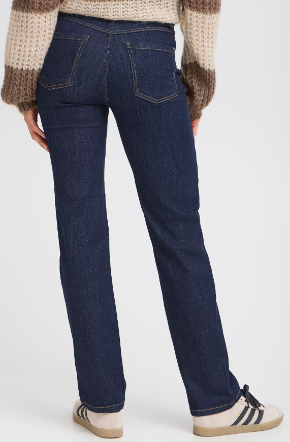 High waist jeans i en mørk farve med brune syninger. sidder til kroppen med lidt løsere bukseben.