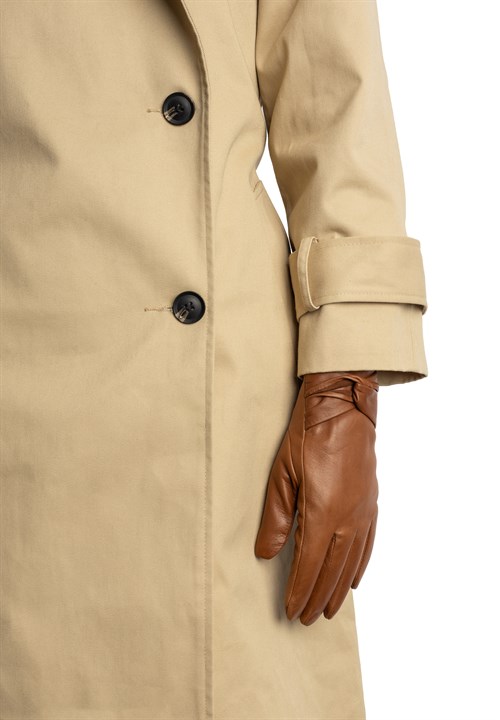 Bløde klassiske skindhandsker med lunt for i uld fra Re:Designed. Skindhandskerne har en lille knude detalje ved håndleddet, som gør dem ekstra feminine. Når du skal bruge din smartphone, kan du beholde handskerne på, da spidsen af pegefingeren og tommeltotten har en touchscreen-funktion på både højre og venstre handske. Bemærk at denne funktion kan aftage over tid, da handskerne bliver slidte. En flot og tidsløs handske der kan bruges år efter år.