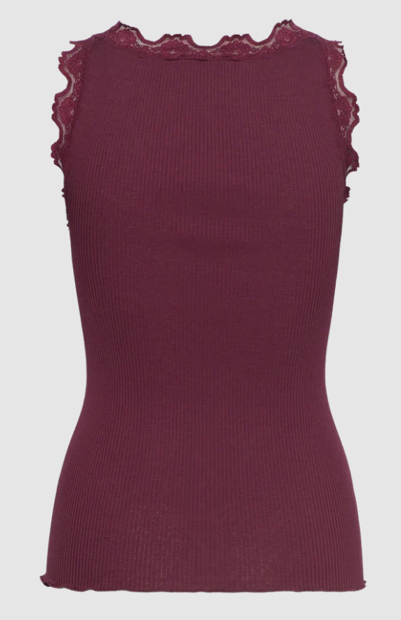 Lækker rosemunde top med blonde detaljer i en flot vinrød farve. Perfekt under bluser der er nedringet, for at give en fin detalje under.