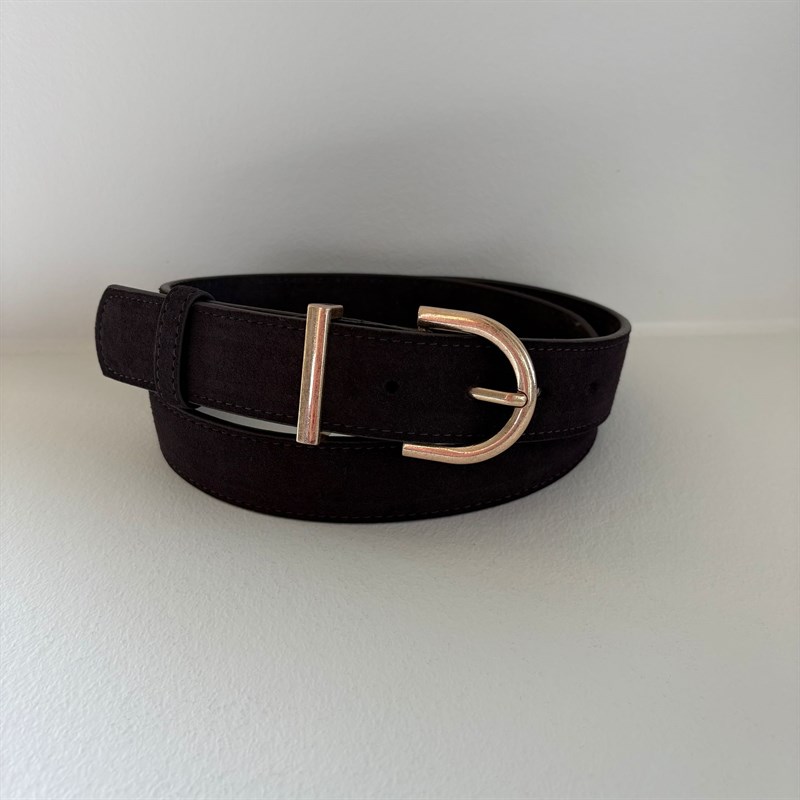 Lækkert ruskindsbælte i en flot mørkebrun. Bæltet har en lidt grovt messing spænde. Passer perfekt til de fleste jeans.