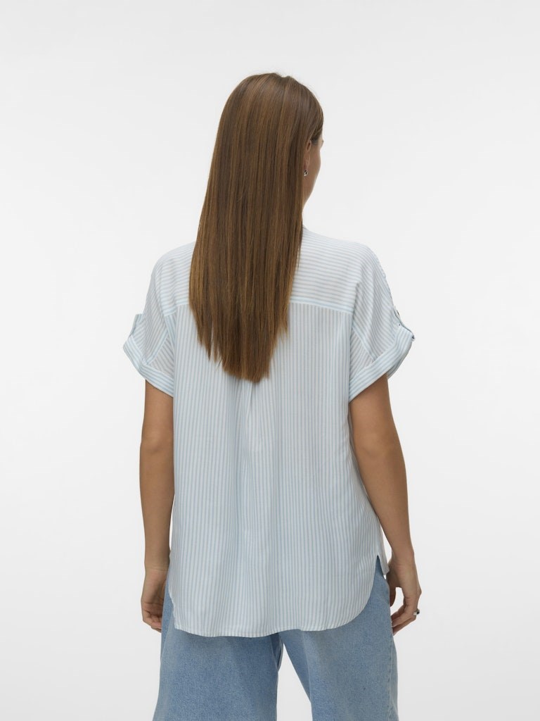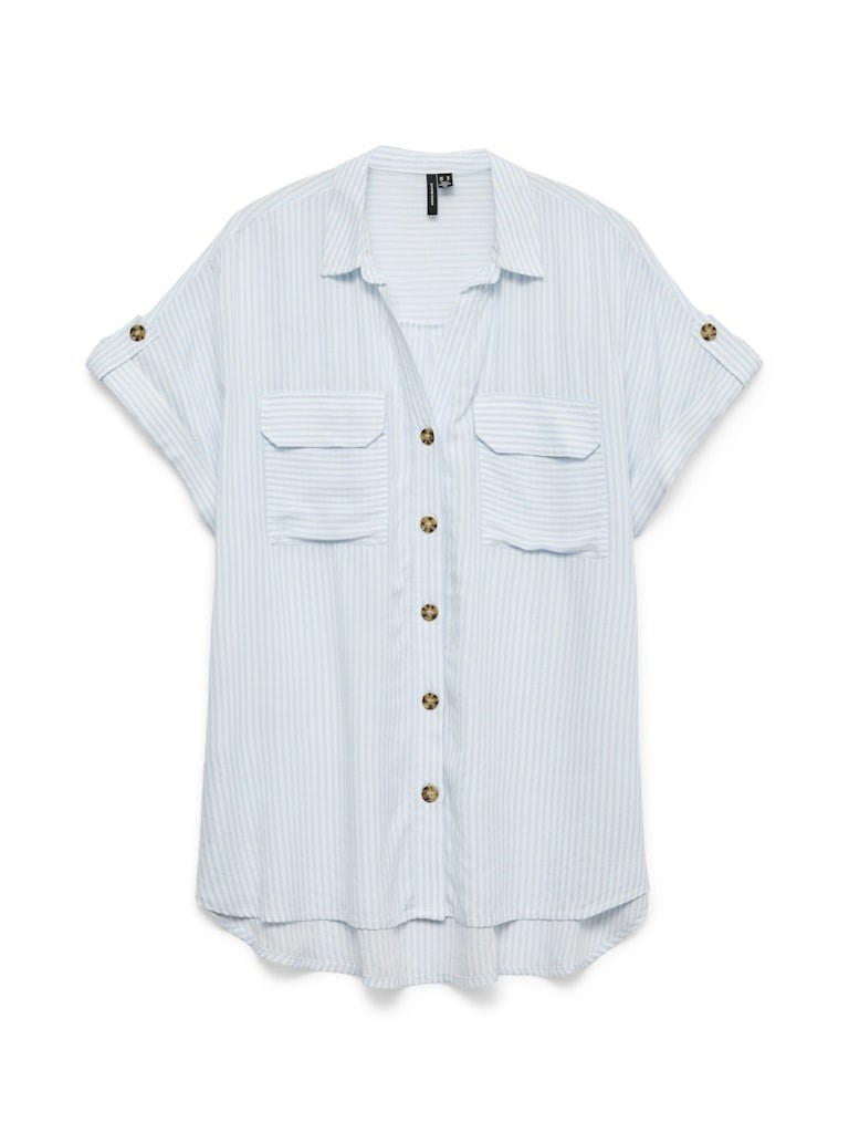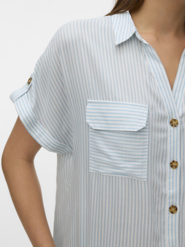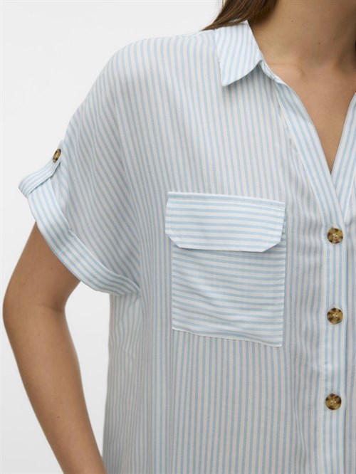 Luftig 100% viskose skjorte i blå og hvid strib med flotte brune knapper hele vejen ned. Skjorten har to lommer på brystet og et lille op smøg på ærmet som lukkes med en knap. Super flot til alt denim.