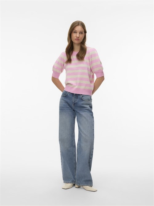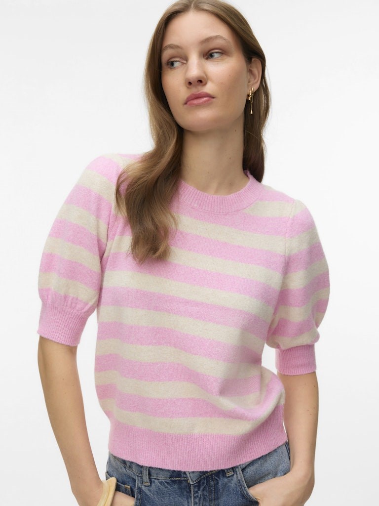 Den populære bløde strik, model Doffy fra Vero Moda. Strikken har kort ærme og striber i lyserød og råhvid. Super fin til et par jeans.