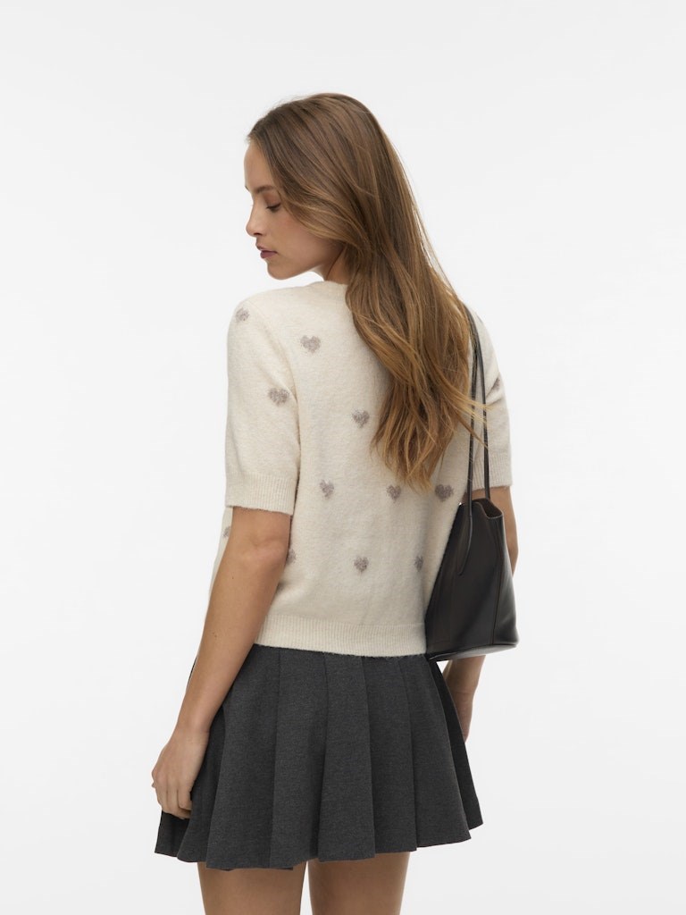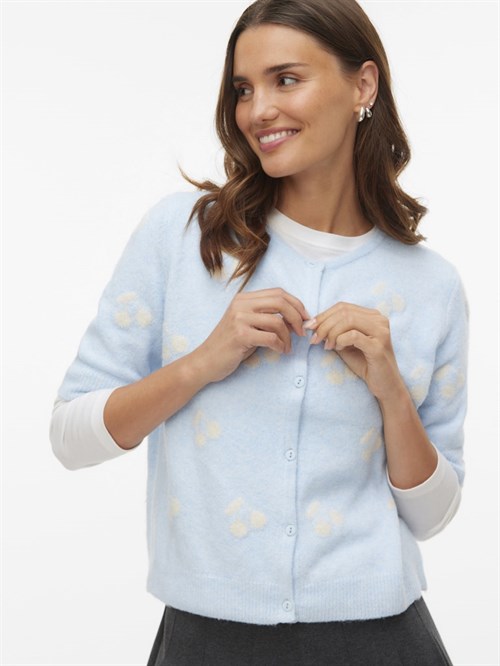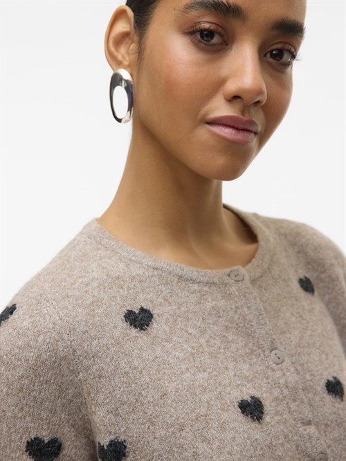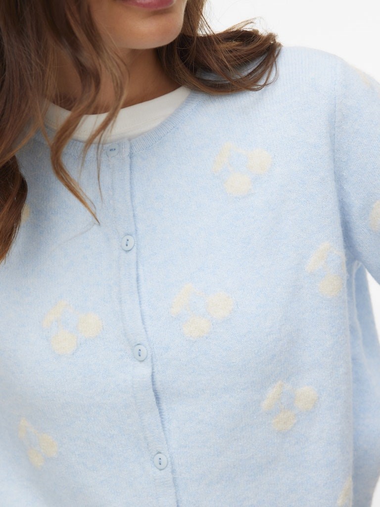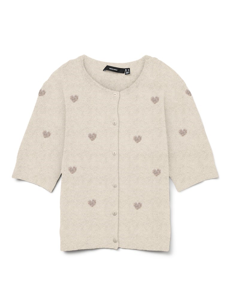 Blød strik cardigan med kort ærme og mønster fra Vero Moda, model Doffy. Strikken har et lille 2/4 ærme og er gennemknappet, fås i 3 varianter med hjerter og kirsebær.