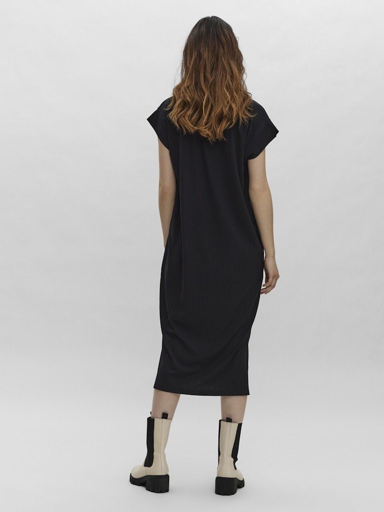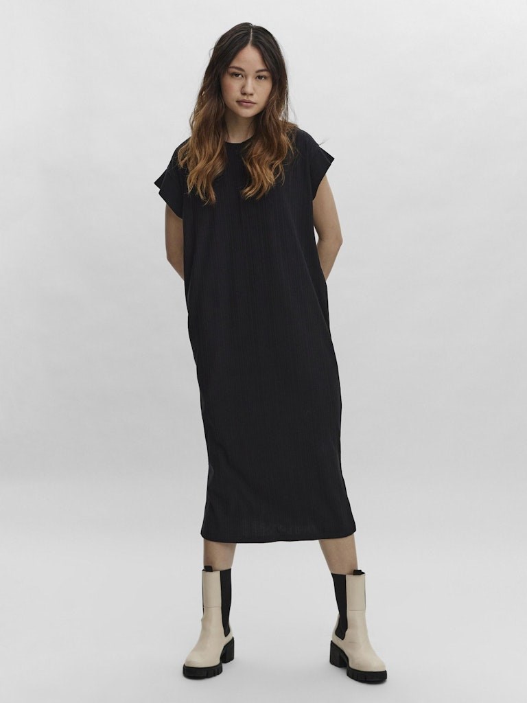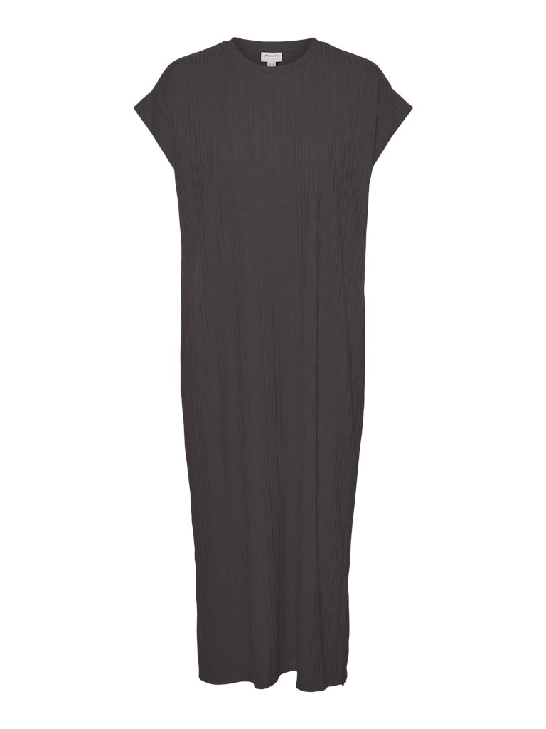 Lækker luftig lang kjole med korte ærmer i to farver, sort og brun, kjolen er i en stribet materiale. Kjolen har slids i begge sider for neden. Style den til sommer med et par klipklapper.