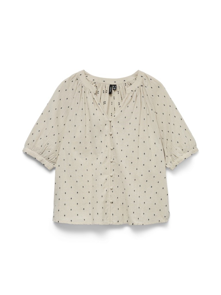 sandfarvet skjorte/bluse med sorte prikker. Skjorte/ blusen har korte ærmer og V-hals som lukkes med knapper hele vejen ned.