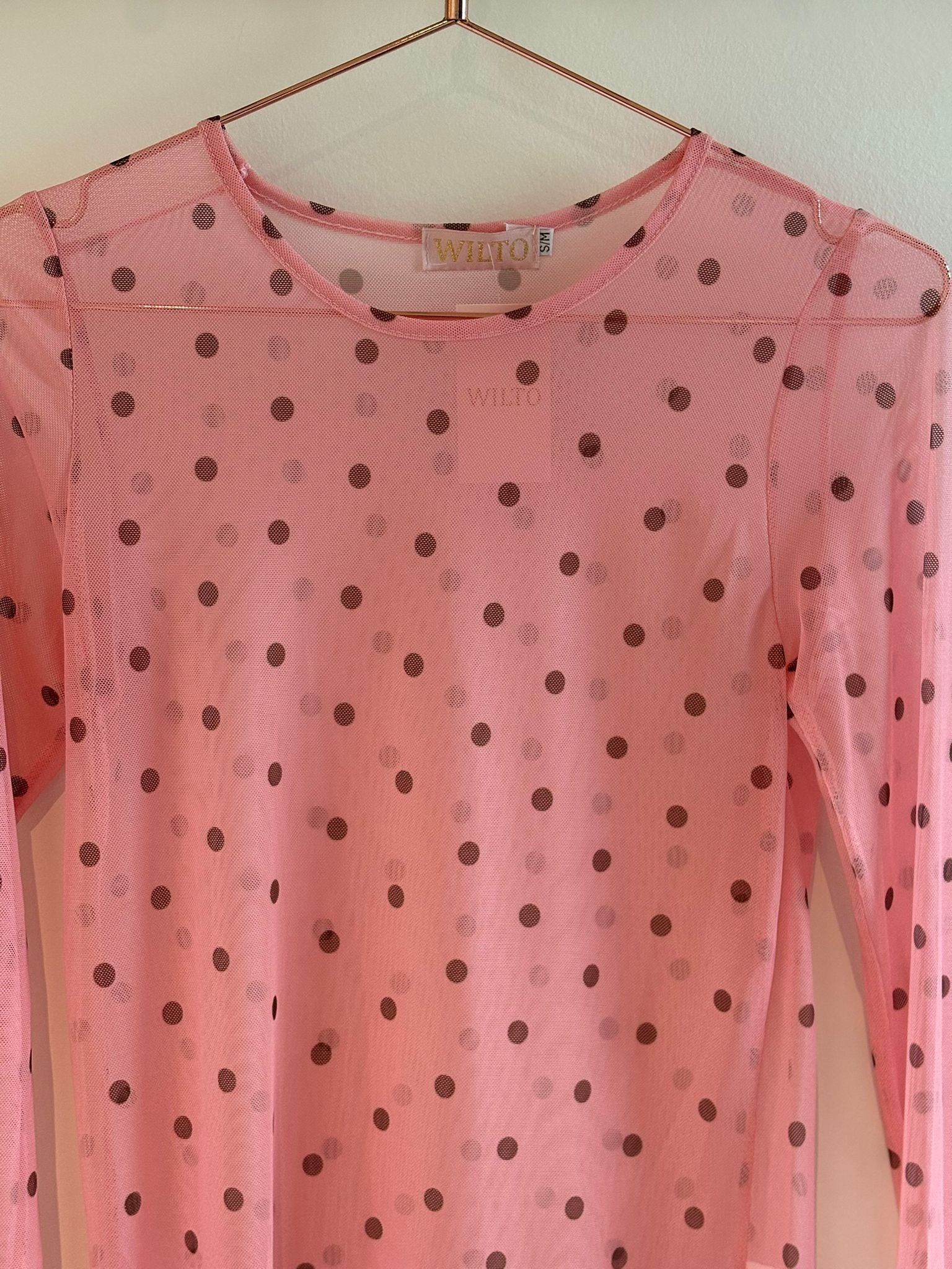 Fin mesh bluse med lange ærmer og rund hals fra Wilto. Blusen er i en smuk lyserød farve med brune prikker, og er perfekt til at have under strik, skjorte osv. Kvaliteten er med stretch og super blød.